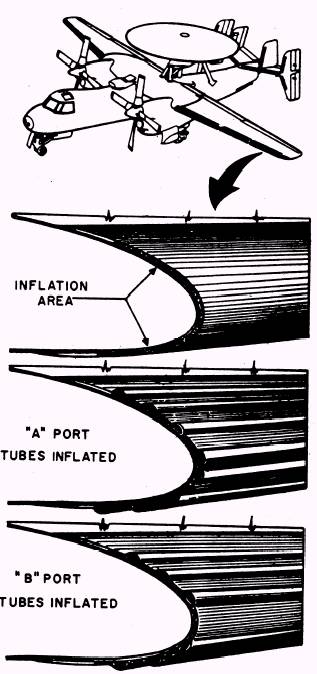Figure 1-7.- Deice boot location/ operation. suction port is connected to the main suction line from the ejector. Approximately 4 in Hg. suction is available at all times to the distributor valves. Each distributor valve has two solenoids that, when energized, allow air pressure to inflate their respective boot tubes, as was shown in figure 1-7. When the solenoids are de-energized, the valves allow suction to be applied to the boots, holding them down (deflated) in flight.