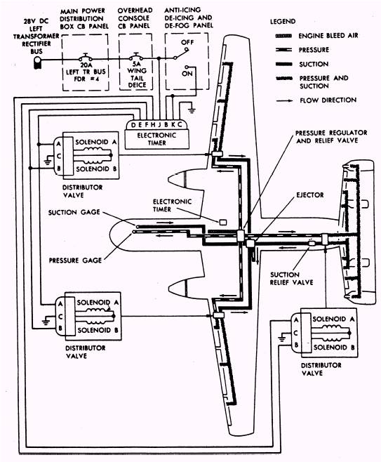 ELECTRONIC TIMER.- A timer controls the inflation and deflation of the deice boots by alternately energizing and de-energizing the solenoids of the distributor valves in a specific sequence. Pressure and suction are applied to the boots in the following sequence: the inboard wing boots, the outboard wing boots, the outboard stabilizer and vertical fin boots, and the inboard stabilizer and fin boots. Each group of boots is inflated for approx-imately 5 seconds, and the succeeding group begins inflating approximately 10 seconds after the first group begins deflating. The total time for the complete inflation cycle to all four boot groups is approximately 1 minute. The timer is a sealed unit and is maintained by personnel in the AE rating.