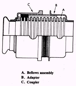 Figure 3-7.- Flexible line connectors. duct sections, as illustrated in figure 3-7, the gap between the duct ends should be 1/ 8 inch minimum to 3/ 4 inch maximum. When install-ing the clamps on the connection, the clamp should be 1/ 4 inch minimum from the end of the connector. Misalignment between the ducting ends should not exceed 1/ 8 inch maximum. When installing flexible line connectors, such as the one illustrated in figure 3-8, follow the steps listed below to assure proper installation and security: 1. Fold back half of the sleeve seal and slip it onto the sleeve. 2. Slide the sleeve (with the sleeve seal partially installed) onto the line. 3. Position the split sleeves over the line beads. 4. Slide the sleeve over the split sleeves and fold over the sleeve seal so that it covers the entire sleeve. 5. Install the coupling over the sleeve seal and torque to correct value. NOTE: Torque values for the various sizes and types of couplings maybe found by referring to the applicable MIM. Some couplings will have the correct torque value marked on the outside of the band. When installing rigid line couplings, follow the steps listed below and illustrated in fig-ure 3-9: 1. Slip the V-band coupling over the flanged tube. 2. Place a gasket into one flange. One quick rotary motion assures positive seating of the gasket. 3. Hold the gasket in place with one hand while the mating flanged tube is assembled into the gasket with a series of vertical and horizontal motions to assure the seating of the mating flange to the gasket. NOTE: View B of figure 3-9 illustrates the proper fitting and connecting of a rigid line coupling, using a metal gasket between the ducting flanges.