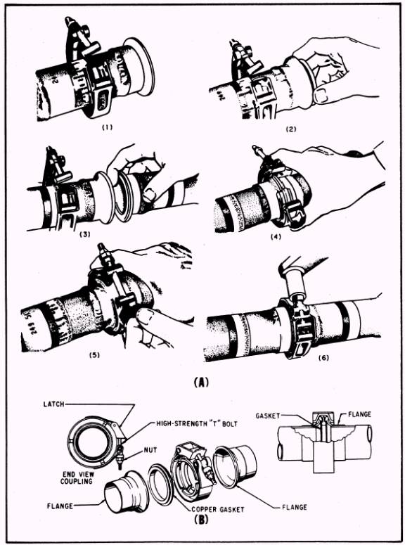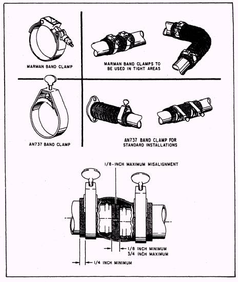 Figure 3-8.- Installation of flexible line connectors. 4. While holding the joint firmly with one hand, install the V-band coupling over the two flanges. 5. Press the coupling tightly around the flanges with one hand while engaging the latch. 6. Tighten the coupling firmly with a ratchet wrench. Tap the outer periphery of the coupling with a plastic mallet to assure proper alignment of the flanges in the coupling. This will seat the sealing edges of the flanges in the gasket. Tighten again, making sure the recommended torque is not exceeded. 7. Check the torque of the coupling with a torque wrench and tighten until the specified torque is obtained.