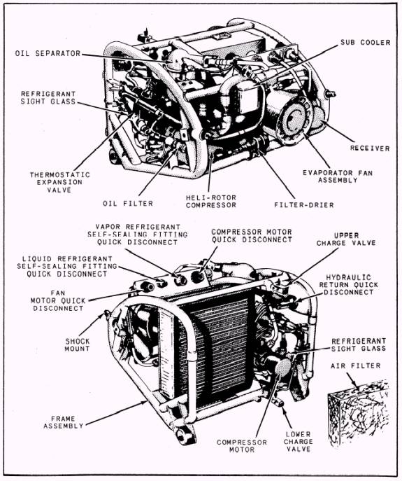 Operations and Components The Grumman Aerospace Corporation chose a Freon 12 vapor cycle ACS to provide avionics equipment cooling in the E-2 "Hawkeye" aircraft. This system, the VEA6-1, is described in this section. The basic difference between the basic vapor cycle system and the VEA6-1 system is the method of compensating for the variations in ram air temperature and the variation in the flow of ram air, which is dependent on aircraft speed. Figure 3-12 is a schematic diagram of the VEA6-1 vapor cycle ACS. In the E-2 configuration, the vapor cycle system cools, filters, and distributes avionics compartment air at a temperature of 38 5 F. The system consists of a vapor cycle cooling scoop assembly, an evaporator group assembly, and air distribution ducting interconnected by refrigerant lines and electrical wiring. The evaporator assembly (fig. 3-13) is a compact, quick-change package that can be easily installed, removed, and serviced as a unit. The assembly is composed of five quick-dis-connect couplings; two shock mounts; tem-perature controls; a hydraulic, motor-driven, self-lubricating Freon compressor; a receiver; a subcooler; a thermostatic expansion valve; an evaporator; hydraulic motor-driven fan; and an oil separator. The vapor cycle cooling scoop assembly is mounted on the top of the fuselage and consists of a condenser assembly, ejector nozzles, an actuator and flap, and a refrigerant pressure actuator control switch. The Freon 12 in the closed system is the primary coolant. The forced air that is drawn through the evaporator in a continuous cycle is the secondary coolant. The electronic equipment is cooled by the secondary coolant, which removes heat by direct contact with the equipment to be