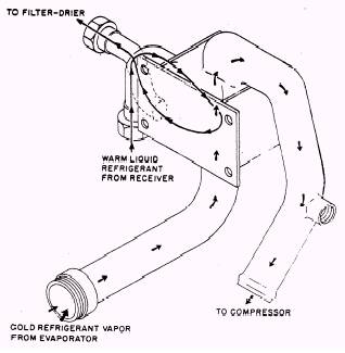 The liquid on the way to the thermostatic expansion valve is relatively warm in comparison to the cold gas leaving the evaporator. Although the gas leaving the evaporator has absorbed heat from the air being circulated through the evaporator, its temperature is still in the vicinity of 40 F. This cool gas is fed through the subcooler where it picks up additional heat from the relatively warm liquid Freon 12 that is flowing from the receiver. This heat exchange causes the liquid to be subcooled to a level that ensures little or no flash gas on its way to the evaporator.