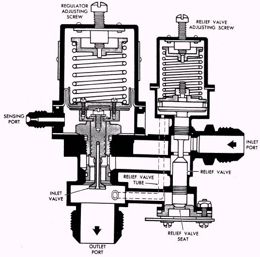PRESSURE REGULATOR AND RELIEF VALVE.- This valve (fig. 1-9) converts the uncontrolled bleed air to a regulated air pressure of approximately 18 psi and routes it to the three distributor valves and the pressure gage. The combination valve is basically separate regulator and relief valves with the two valve bodies brazed together. A sensing line allows air downstream of the valve to be ported to the diaphragm in the valve's regulating chamber. As pressure builds up downstream, the diaphram raises, compresses the regulating spring, and raises the inlet valve toward its seat. When the predetermined outlet pressure is reached, the inlet valve is fully seated, shutting off the flow of bleed air through the valve. When the downstream pressure drops below the regulator setting, it reduces the air pressure under