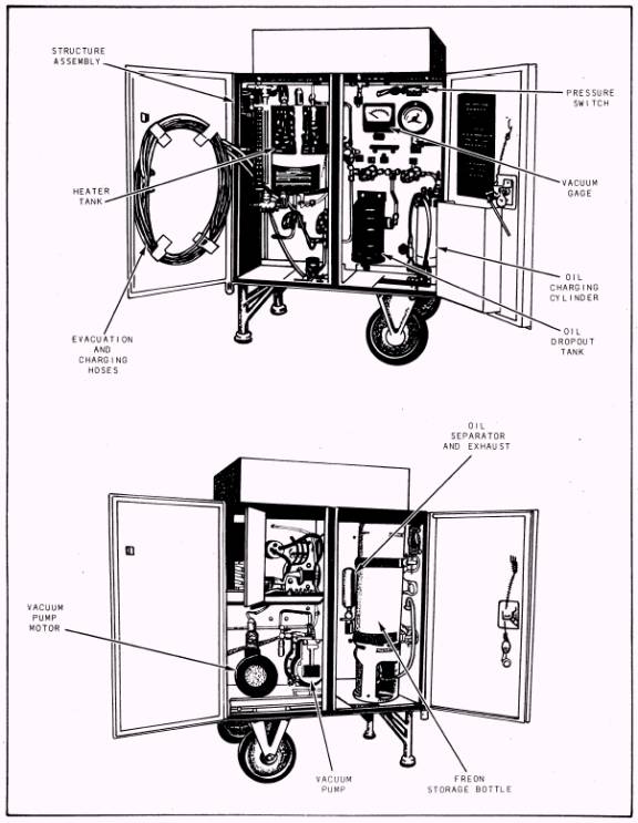 Maintenance Maintenance of the vapor cycle ACS, like the air cycle system, will generally require the joint efforts of personnel from the AME and the AE ratings. Malfunctions of the hydraulic motors that drive the compressor and evaporator fan will require the services of an AMH. Operational checkout of the vapor cycle system can be done in several ways. The AE can perform an operational check of the electrical portion of the system using a Cooling System Test Set, AN/ ASM 232 (XN-1), with the engines not running. Performing an operational check of the complete vapor cycle system without the engines running requires external hydraulic and electrical power and a source of cool air. The cooled air is ducted into the condenser scoop inlet to provide flow through the condenser for con-densing the Freon. As was stated earlier, this function is normally done by ram air when sufficient ram airflow is available or by engine bleed air leaving the ejector nozzles and creating a pressure differential that causes sufficient flow for cooling on the ground when the engines are running. The operational check steps as specified in the applicable MIM should be performed in sequence. If a trouble occurs during a step, it must be corrected before proceeding. Isolation of the trouble can almost always be enhanced by referring to the step of the troubleshooting table that corresponds with the step of the operational checkout where the trouble occurred. Additional organizational-level maintenance on the vapor cycle system includes servicing (adding refrigerant and lubricating oil), leakage testing and correcting of leaks, and removal and installation of components. Intermediate-level maintenance of the evaporator assembly, the cindenser group assembly, and the air ejector shutoff valve is restricted to replacement of parts listed in the Spares and Repair Parts Data List provided in the intermediate repair section of the applicable MIM (Part IV). Special test equipment is required to bench test most of the vapor cycle components or assemblies; therefore, not all intermediate-level activities possess the capability to accomplish such maintenance. Since proper servicing of the vapor cycle system is one of the most important factors affecting operation, equipment used for servicing and servicing procedures are given brief coverage in the following paragraphs. Servicing Equipment preferably together as a system, with refrigerant and/ or lubricating oil. Servicing of the vapor cycle system involves The vapor cycle charging cart (fig. 3-18) is evacuating and charging the condenser and used to replenish the vapor cycle refrigeration evaporator group assemblies either separately or system with refrigerant and the compressor with
