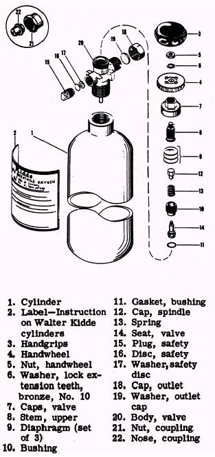 Basically, all gaseous oxygen systems consist of the following: 1. Containers (cylinders) for storing the oxygen supply 2. Tubing to route the oxygen from the main supply to the user( s) 3. Various valves for directing the oxygen through the proper tubing 4. A metering device (regulator) to control the flow of oxygen to the user 5. A gauge( s) for indicating the oxygen pressure 6. A mask to direct the oxygen to each user's respiratory system Cylinders Gaseous oxygen cylinders used in naval aircraft systems are generally high-pressure, nonshatterable cylinders. The term shatterproof or nonshatterable indicates that the cylinder is designed to resist shattering when punctured by a foreign object, such as gunfire, at a pressure of 1,800 psi. The resistance to shattering is generally achieved by the use of a heat-treated alloy or wire wrapping applied to the outside of the cylinder. The two most common cylinder sizes are 514 and 295 cubic inches. The main advantage of the high-pressure cylinder is that it minimizes space used for storing gaseous oxygen. All high-pressure oxygen cylinders are painted green in accordance with the established color codes provided in MIL-STD-101A. Cylinders come equipped with either a man-ually operated handwheel valve or an automatic self-opening valve (figs. 4-1 and 4-2). Opening the handwheel operated valve assembly releases the contents of the cylinder. The handwheel has four 5/ 15-inch diameter holes for the attachment of remote-operation equipment, if needed.