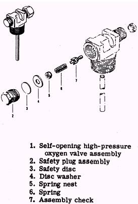 Figure 4-2.- Self-opening oxygen cylinder valve The valve is equipped with a fusible metal safety plug and a safety disc to release the contents of the cylinder if the pressure becomes excessive because of high temperatures. The safety plug is filled with a fusible metal designed to melt at temperatures ranging from 208 to 220 F (97.8 to 104.5 C). The cylinder and valve assembly is connected to the oxygen tubing by silver soldering the tubing to a coupling nose and securing the nose to the valve outlet with a coupling nut. The self-opening (automatic) oxygen cylinder valve is automatically opened when it is connected to the oxygen line. The use of this type of valve permits remote location of the oxygen cylinder to places less vulnerable during combat and more readily accessible for servicing. Regulators The success or failure of high-altitude flight depends primarily on the proper functioning of the oxygen breathing regulator. Acting as a meter-ing device, the regulator is the heart of the oxygen system. To perform successfully in an air-craft system, a regulator must deliver the life-supporting oxygen in the quantities demanded throughout its entire range of operation. Although personnel of the PR rating are primarily responsible for maintenance of regulators, the AME is responsible for per-forming operational checks in the aircraft and for removal and installation. In other words, the AME removes a malfunctioning regulator from the aircraft and delivers it to the shop where the PR determines the trouble and makes the necessary repairs. When the trouble is corrected, the AME reinstalls the regulator in the aircraft. Tubing Two types of tubing are used in aircraft oxygen systems. Low-pressure aluminum alloy tubing is used in lines carrying pressures up to 450 psi. High-pressure copper tubing is used in lines carrying pressure above 450 psi. NOTE: Some of the newer naval aircraft are equipped with high-pressure oxygen lines made of aluminum alloy. Lines running from the filler valve to each of the cylinders are called filler lines. Those running from the cylinders to the regulators are called distribution or supply lines. Oxygen lines, like all other lines in the aircraft, are identified by strips of colored tape. The strips of tape are wrapped around each line near each fitting and at least once in each compartment through which the line runs. The color code for oxygen lines is green and white with the words Breathing Oxygen printed in the green portion, while black outlines of rectangles appear in the white portion. Resistance to fatigue failure is an important factor in oxygen line design because the line pressure in a high-pressure system will at times exceed 1,800 psi, and at other times be as low as 300 psi. Because of these varying pressures and temperatures, expansion and contraction occur all the time. These fluctuations cause "metal fatigue," which must be guarded against in both the design and the construction specifications for tubing. Steps are taken during installation to prevent fatigue failure of the tubing. Tubing is bent in smooth coils wherever it is connected to an inflexible object, like a cylinder or a regulator. Every precaution is taken to prevent the accidental discharge of compressed oxygen because of faulty tubing or installation. Although simple in con-struction and purpose, tubing is the primary means by which oxygen is routed from the cylinders to the regulator stations. High-pressure tubing is usually seamless copper tubing, and is manufactured in accordance with strict specifications. It has an outside diameter of 3/ 16 inch and a wall thickness of 0.035 inch. For application in high-pressure oxygen installations, copper tubing is type N (soft annealed), and is pressure tested at not less than 3,000 psi. High-pressure tubing is used between the oxygen cylinder valve and the filler connection in all systems, between the cylinder valve and the regulator inlet in high-pressure systems, and between the cylinder valve and pressure reducer in reduced high-pressure systems. To connect high-pressure copper tubing, adapters and fittings are silver soldered to the tubing ends. Due to the high pressures involved, the security (leak tightness) of all high-pressure lines relies primarily on a metal-to-metal contact of all its fittings and connections. A fitting properly silver soldered to the end of a length of copper tubing will not come loose or leak. Some of the later models of naval aircraft use aluminum alloy or stainless steel tubing in high-- pressure oxygen system installations. Replacement tubing should be manufactured of the same type material as the original tubing or a suitable substitute as specified in the MIM.