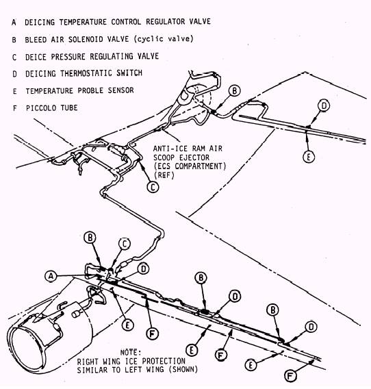 Figure 1-10.- Ice protection system. and spring-actuated to the closed position and serve as system shutoff. With the pressure regulator valves in the energized position, bleed air flows through ducting to the cyclic valves. Any time the empennage pressure regulator valve is open, the ram air scoop ejector is provided with a continuous flow of bleed air for anti-icing. The cyclic valve solenoid, when energized, ports pressure to the inlet side of the cyclic valve, and vents the outlet side of its pilot valve to atmosphere. Pneumatic pressure from the inlet side causes the cyclic valve to open. Bleed air will then flow through the ducting for that segment to the respective piccolo tube, where it is directed to flow onto the inner skin surface to raise the skin temperature above freezing. On the wing, bleed air flows along the contour of the skin, and is vented overboard between the leading edge flap lower seal and the fixed wing. For the horizontal stabilizer, the bleed air, after leaving the piccolo tube, flows spanwise in the leading edge plenum, and flows overboard at the tips. To ensure that the flow of bleed air is directed to the appropriate points regardless of the positions of movable surfaces such as leading edge flaps and the horizontal stabilizer, extension ducts and leakproof rotary joints are incorporated. Also, a special wing fold seal permits wing folding while providing a leakproof junction when the wings are spread. The timing control provides electrical signals to operate the pressure regulator valves and the cyclic valves in the proper sequence. The sequence is as follows: left outboard wing, right outboard wing, left center wing, right center wing, left inboard wing, right inboard wing, left horizontal stabilizer, and right horizontal stabilizer. Electric power (28 Vdc) is applied to the timing control by setting the deice switch on the environmental panel on the center console to WING EMP for continuous operations, or to SINGLE CYCLE for operation of the system, through one complete sequence. Setting the deice switch to WING EMP energizes the solenoids on the pressure regulator valves, which causes all three pressure regulator valves to open if a bleed-air pressure of 30 psi or more is available. This pressure allows bleed air to flow to the eight cyclic valves. If the wings are folded, the wing pressure regulator valves will not be energized because the wing fold interrupt switch will be in the open position. When the wings are extended, the timing control energizes the cyclic valves in proper sequence. Each solenoid is energized for 30 seconds, which causes each cyclic valve to be pneumatically opened by bleed air, to allow hot bleed air to flow through the piccolo tube for 30 seconds or until the skin reaches 60 3 F (15 1.6 C) as sensed by the temperature sensor. When the skin temperature exceeds 60 3 F, the temperature sensor provides a signal to the timing control to de-energize the solenoid for that cyclic valve. For in-flight operation, setting the deice switch to SINGLE CYCLE will cause the system to operate in the same way as it does when the deice switch is set to WING EMP except that upon completion of one sequence, the switch will return to the OFF position. For ground operation and checkout of the deice system, setting the deice switch to SINGLE CYCLE will permit the system to function through one complete cycle even if the skin temperatures exceed 60 3 F. The interrupt feature of the temperature sensors is disabled only in the single-cycle mode and only when the aircraft is on the landing gear. If a cyclic valve fails to fully open when scheduled, a mechanical position switch signals the timing control, which causes the DEICE FAIL indicator light on the annunciator panel on the center instrument panel to come on. This indicator light will go off when the 30-second interval for that cyclic valve is completed. If the pressure regulator valve fails in the closed position, bleed air will not be available to actuate the cyclic valve. Again, the DEICE FAIL indicator light will come on for each cyclic valve downstream from the malfunctioning pressure regulator valve. If a temperature sensor fails or a cyclic valve fails while open, which results in the skin temperature exceeding 200 5 F (93 2 C), a thermo switch closes, and the DEICE HOT indicator light on the annunciator panel comes on. The WING EMP deicer system is functional during all normal flight operating conditions. During the engine-start cycle and during single-engine operations, the deice system is functionally inhibited. Normal deicing becomes available when both engines are operating. When operating on a single engine, deice can be recovered by setting the air-conditioning and deice switches on the environmental panel to OFF/ RESET and WING EMP, respectively. Engine and engine nacelle inlet anti-icing (fig. 1-11) is accomplished by 14th stage bleed air, which is separated, in each engine pylon, from 14th stage air being used for other environmental control system (ECS) purposes. The anti-ice switch on the environmental panel on the center console, when set to the ENG & PITOT position, opens both engine anti-icing valves by de-energizing their solenoids to direct 14th stage bleed air, regulated to 22.5 2.5 psi, to the engine nacelle leading edges and engine anti-icing systems. The position of each anti-ice valve is shown on the copilot's advisory panel; 1 A-ICE ON and 2 A-ICE ON indicator lights come on whenever the anti-ice valves are open. The engine anti-ice switch also opens the empennage pressure regulator valve to provide a source of constant bleed air to the ram air inlet duct anti-icing shroud (unless the deice system is being operated, the empennage cyclic valves will remain inactive/ closed). The engine anti-icing valve activates the entire deice system. The deice system cannot be operated until the anti-ice switch is set to the ENG & PITOT position. The bleed-air deice/ anti-icing system 