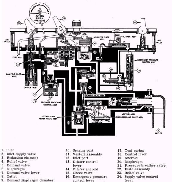 Figure 4-14.- MD regulator operational drawing. inlet assembly into the inlet supply valve (2), and 2. The reduction chamber incorporates the then into the first-stage reduction chamber (3) by first-stage relief valve assembly (4) to protect the action of the inlet supply valve control lever 24. regulate; against overpressures. The pressure of the flowing oxygen is registered 3. The demand valve assembly (5) is opened on the oxygen supply pressure gauge. when the pressure across demand outer diaphragm (6) forces the demand valve lever assembly (7) down. The pressure differential exists during the inhalation cycle of the user by creating a reduction in the pressure outlet (8). 4. Reduction in pressure at the pressure outlet is sensed in the demand diaphragm chamber (9) through the sensing port (10). 5 During periods of flow, the oxygen passes through the venturi assembly (11). At the venturi assembly, the flow of oxygen mixes with ambient air, which enters the regulator through the inlet ports (12). 6. The addition of ambient air to oxygen is controlled by the manual diluter control lever (13) and by the diluter aneroid assembly (14), which automatically produces a 100-percent oxygen concentration at altitudes above 32,000 feet. 7. The aneroid check valve assembly (15) prevents a flow of oxygen out through the inlet ports. 8. The emergency pressure control lever (16) applies force to the emergency pressure control test spring (17), which mechanically loads the emergency pressure diaphragm (25) through the control lever and center assembly (18). Mechanical loading of the emergency pressure diaphragm provides positive pressure at the regulator outlet. 9. Both automatic safety pressure and pressure breathing at altitudes above 30,000 feet are provided through pneumatic actuation of the aneroid assembly (19). This function begins near 27,000 feet altitude. The force exerted on the diaphragm assembly (20) by the aneroid assembly actuates the pressure breather valve assembly (21), and oxygen flows to the diaphragm and the plate assembly (22), which is pressure loaded by this volume of oxygen acting on the demand valve lever assembly to the extent that the positive pressure is built up at the pressure outlet as the altitude increases. 10. Additional safety is obtained through the inclusion of the second-stage relief valve assembly (23) in the regulator.