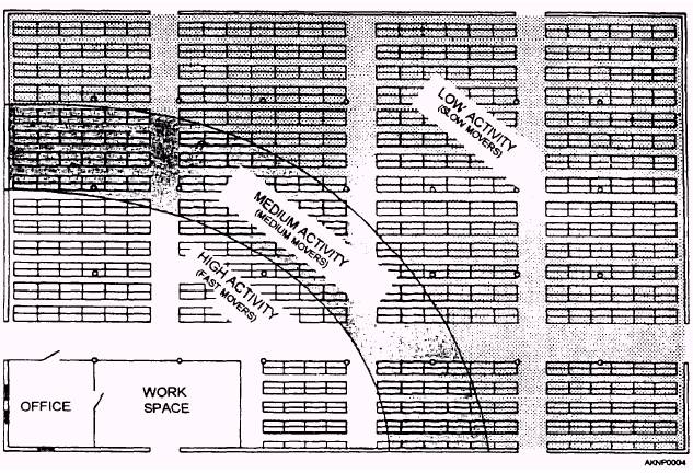 Figure 2-4.-Popularity storage method. Shipping and Receiving Areas These areas consist of the staging and load accumulation space used to support the shipping and receiving functions. These support areas may include a small office or desk for use by the shipping and receiving foremen. In general, they do not contain large amounts of Office space. Truck Dock Areas Certain areas aree used for loading and unloading highway trailers. They are located immediately in front of the truck dock doors that are used for securing the operating area. Battery Charging and Handling Areas These areas consist of the spaces allocated to the charging and handling of vehicle batteries used in the material-handling equipment. When electric vehicles mused, this support area can also include maintenance areas and other work areas associated with the maintenance and upkeep of the material-handling vehicles. Preservation, Packaging, Packing, and Crating Areas 'These support areas consist of any area dedicated to the protection or packaging of any material being stored or handled in the facility. These areas are generally associated with the receiving function of presentation and the shipping funnction of packing, packaging, and crating areas. |