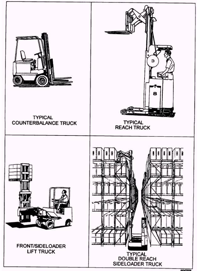 Figure 2-9.-Forklift trucks. 2-26 Forklift Trucks Forklift trucks (fig. 2-9) are vehicles designed to pick up and carry unit loads of materials. The types of forklift trucks commonly used by the AKs are discussed in the following paragraphs. COUNTERBALANCED TRUCKS.- TMS type of truck (fig. 2-9) carries the pallet load straight in front on permanently aligned forks. These trucks must turn at right angles to place the material in storage. They require wide aisles and substantial floor capacity. They are available in electric or internal combustion models. NARROW-AISLE TRUCKS.- These trucks are in three categories; the straddle, reach, and side-loading truck (figure 2-9). In straddle trucks, the load is carried between the front outrigger wheels to minimize the need for counterbalancing. Straddle forklift trucks are also known as tiering trucks. The reach truck is a variation of straddle or tiering truck. It is commonly used in shore activities. It is more maneuverable than the standard forklift trucks and can generally operate in narrow aisles. Side-loading trucks normally operate to one side of the aisle and place the load laterally. These trucks come in various designs. Some travel along the length of the aisles with permanently located masts, equipped with a reach device to move the forks out from the side. Some types have moving masts that add to the extension capability and permit double placement of the load. Other types have a rotating or swing mast that can reach out to the side. These types of trucks are also known as front/side loaders. Dollies A dolly is a small, low platform load carrier that is generally equipped with rollers, casters, or wheels. Dollies are hand propelled (do not have handles) and are used for low-volume moves over short distances. The types of hand trucks are the two-wheel and four- or six- wheel platform. TWO-WHEEL HAND TRUCKS.- Two-wheel hand trucks are designed for tilt and carry operation. They are generally used for moving small volume and lightweight items over variable paths and limited space. HANDLIFT TRUCK, MK 45.- This is a special type of hand truck that is used for lifting and maneuvering long heavy containers. They are used in pairs with one truck positioned at each end of the container. The AKs may use this type of truck for moving some types of aircraft engine containers such as an F404 engine container. This truck consists of an aluminum body, a tow bar, and a lift mechanism It is equipped with two wheels and polyurethane tires. The lift mechanism includes a lift arm and a mounting pin for engaging the load. The lift mechanism is manually operated by a reversible ratchet wrench to raise or lower the lift arm assembly. (See figure 2-10 for an illustration of handlift truck, Mk 45.) When used on board ship, this equipment is usually under the inventory responsibility of the weapons department. FOUR-WHEEL HAND TRUCKS.- The four-wheel hand trucks are rectangular load-carrying platforms fitted with a handle at one or both ends. Some types are equipped with two swivel casters located at the comers of the platform. Other models have two large wheels centered on the sides and two smaller wheels centered on the ends. The four-wheel hand trucks are used for moving low volume and light loads for short distances. |