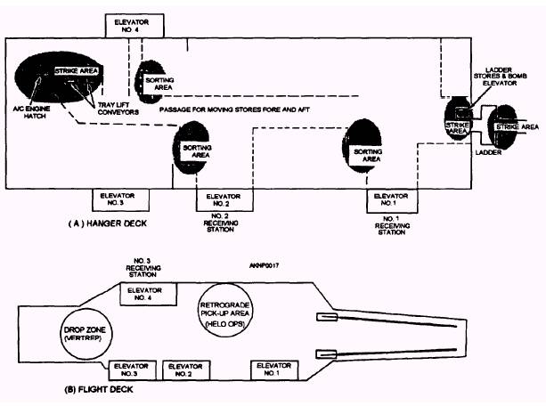 DEPARTMENTAL RESPONSIBILITIES.- Replenishment at sea is considered an all-hands evolution. With the exception of a major ammunition movement, UNREPs involve more personnel directly and physically than any other operation. Material is removed from the staging area of the issuing ship, loaded onto cargo nets, and sent to the receiving ship at rates in excess of 100 tons per hour. This material must be removed from the receiving area as fast as it arrives and moved to staging areas or to storerooms at approximate] y the same rate. Close coordination of all hands must be followed to move the material efficiently. The executive officer (XO) is responsible for overall control and coordination of the UNREP. Before the scheduled UNREP, the XO convenes a meeting of all department heads and assigns individual responsibilities. The detailed planning and the day-to-day coordination with other departments are normally assigned to the supply officer. The XO is kept informed of programs in the planning of the UNREP and takes an active part only when difficulties arise that cannot be handled at the lower level. During the replenishment, the XO remains on the bridge and the supply officer is in charge of the movement of stores when received on board. Although departments other than supply are actively concerned with the replenishment, the weapons and air departments have the greatest responsibility. The operations department irresponsible for mail being transferred and for transfer of personnel when required. The engineering department is responsible for manning the elevator pump rooms, granting permission to open hatches as required, and making sure that sound-powered telephones are available and in working condition. The aircraft intermediate maintenance department (AIMD) is responsible for maintaining forklifts and other materials-handling equipment. Weapons Department.- The weapons department is responsible for physically loading the material on board the receiving ship (except during VERTREPs), enforcing all safety precautions at replenishment stations, and making sure that all nets, slings, pallets, and other handling material belonging to the delivering ship are returned. Only weapons department personnel are authorized to operate weapons department elevators when used to strike incoming stores below decks. The weapons department representative is primarily concerned with the expected tonnage and the rate at which the stores come aboard. Air Department.- The air department is responsible for providing direction to the helicopter in spotting each net load received during VERTREPs. The air department must be informed of the amount of clear deck space required and the elevators that must be manned during the replenishment. Replenishment procedures cover several areas that require the knowledge and attention of a senior AK These areas include the different stations used during replenishment, the personnel required, the equipment to be used, and the actual procedures employed for the receiving, strike, and transfer of accountability. A replenishment station is any location where some significant action is taken on the stores being received. The replenishment stations may be divided into three general groups-receiving, sorting, and striking. Stations within a group cover the same function, regardless of location. The locations of replenishment stations on a typical aircraft carrier are shown in figure 3-5. Receiving stations 1 and 2 are on elevators 1 and 2 respectively, with the elevators at hangar deck level. The third receiving station, normally used during VERTREP operations, is on or in the vicinity of the No. 4 elevator. Sorting stations are close to the receiving stations where net loads may be towed by tractor or delivered on roller conveyors. At this point, stores are sorted and palletized on the basis of strike area (station). Major strike areas, as shown in figure 3-5, view A, are located where mechanical equipment is readily available. However, strike areas may be located anywhere close to the ultimate storage area of significant amounts of materials. The RECEIVING STATIONS are the areas where the material is received on board. Most receiving stations are located on the hangar deck. Ship designs vary, even within a class, with consequent variations in number and locations of receiving stations. For example, some ships have receiving stations on elevators 1 and 2 for highline replenishment and a receiving station on elevator 4 for vertical replenishment (VERTREP). Elevators 1, 2, and 3 remain lowered at the hangar deck level while elevator 4 is at the flight deck level until a sufficient amount of material is ready to be lowered to the hangar deck level for receiving. Material is under the control of the weapons department (air department in the case of VERTREPs) until the nets are detached from the transfer rig at the receiving station. When the rig is detached, the accountability of the material then belongs to the supply department and must be removed from the receiving station as quickly as possible. The time interval available is the time required for the hook to travel to