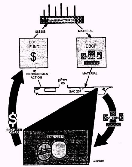 The duties and responsibilities of the financial recordskeeper are vitally important, especially at Shipboard Uniform Automated Data Processing System-Real Time (SUADPS-RT) activities. The financial recordskeeper performs both end-use OPTAR accounting and Defense Business Operations Fund (DBOF) accounting. TYCOMs issue separate OPTARs for the operation and maintenance of the activity, for the repair of other vessels, and for flight operations. These OPTARS are administered and reported as prescribed by the Financial Management of Resources Operating Procedures (Operating Forces), NAVSO P-3013. The DBOF is administered and reported as prescribed by various Naval Supply Systems Command (NAVSUP), Navy Comptroller (NAVCOMPT), and DFAS-CL manuals. The financial recordskeeper must recognize that the OPTAR funds are separate from the DBOF. However, there is a relationship between these two funds that must be understood. DEFENSE BUSINESS OPERATIONS FUND (DBOF) The DBOF is a consolidation of the Navy Stock Fund (NSF) and the Navy Industrial Fund (NIF). The term DBOF replaces the terms NSF, NIF, and Navy Stock Account (NSA). However, other documentation, reports and associated correspondence may continue to refer to NSA, NSF, or NIF. The DBOF is a revolving fund established by Congress to purchase material carried in stock ashore as inventory by the Navy stock points, and material carried afloat by destroyer tenders (ADs), repair ships (ARs), submarine tenders (ASs), combat stores ships (AFSs), aircraft carriers (CVs), nuclear-powered aircraft carriers (CVNs), amphibious assault ships (LPHs), helicopter assault landing ships (LHAs), and marine air groups (MAGs). These activities spend DBOF dollars to procure items expended to an end-use customer. The fund is reimbursed when material is requisitioned for use by charging the customer's OPTAR and crediting the DBOF. This transaction returns the money to the DBOF so that replacement material may be purchased and the revolving fund continued, as shown in figure 6-3. The DBOF also finances the operations that were previously managed under the Navy Industrial Fund (NIF). These are the operations of all industrial-type or commercial-type activities approved by the Secretary of Defense as specific projects under the fund. The operations of the DBOF are governed by the regulations of the Office of Secretary of Defense. Any request for exceptions is submitted to the Comptroller of the Navy via the Naval Supply Systems Command (NAVSUPSYSCOM). SPECIAL ACCOUNTING CLASS (SAC) 207 The activities operating under SUADPS-RT procedures are considered intermediate supply facilities. These SUADPS-RT activities are authorized to carry DBOF items as inventory material. This material is categorized as SAC-207 material to separate
