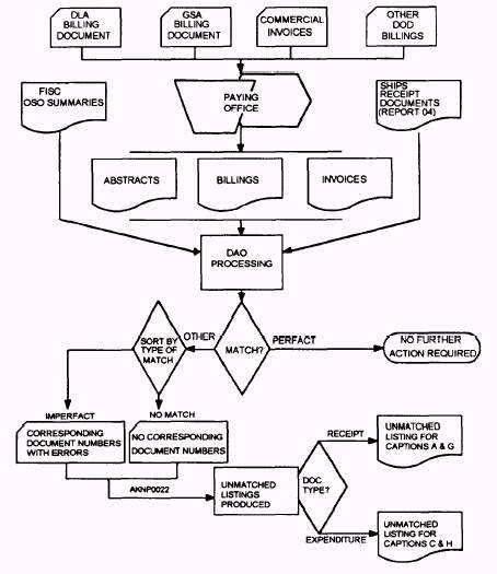 Figure 6-4.-Receipts and billings document flow. expenditures on DAO's files. This listing represents the summaries, transfers from other supply officers, billings from DLA, GSA, or civilian vendors for which the ships have not processed a receipt. Captions C & H are defined as follows: Caption C- OSO Summaries Caption H - Abstracted public voucher payments, DLA billings, and GSA billings The Unmatched Listing for Captions A & G is a listing of all receipts processed by the SAC 207 activity. The receipt is reported to DAO but has not been matched with a bill or summary from the issuing activity. Captions A & G are defined as follows: Caption A - Reported receipt from OSO, FIR codes F4 and F5 Caption G - Reported receipt from purchase, FIR codes A 1, A3, and A4 The Listing of Partially Matched Receipts and Abstracts or Summaries is also distributed by DAO on a monthly basis. This listing informs the activities of those expenditures that were partially matched during the monthly reconciliation cycle. A transaction record will also appear on the unmatched listing for captions C & H for the unmatched quantity and money value. Each record on the listing must be researched and annotated with the appropriate codes listed in appendix 5 of NAVSUP P-567, volume 2. The annotated copy of the listing is returned to the DAO no later than 20 days after receipt. The Follow-up Listing for Captions C & H contains a separate listing of each caption code C & H that represents above threshold unmatched and partially matched expenditures. The expenditures listed are 6 months old and will be overaged on the ninth month if not reconciled. The transactions also appear on the unmatched listing for captions C & H. The listing is researched and annotated according to the procedures in NAVSUP P-567, volume 2. An annotated copy is returned to the DAO no later than 20 days after receipt. A copy must be retained at the SAC 207 activity for at least 1 year. The Adjustment Listing for Captions C & H represents all unmatched and partially matched expenditures that became overaged during the monthly reconciliation cycle, These expenditures were automatically charged (below threshold) as losses to the DBOF. The documents in the listing must be researched and processed accordingly. The Follow-up Listing for Unmatched OSO Receipts is a record of OSO receipts that has been in the unmatched listing for captions A & G for 6 months. The transactions have not matched expenditures from the issuing activity and will become overaged at the ninth month. The transactions must be researched and an annotated copy sent to the DAO no later than 20 days after receipt. A copy of the list is retained at the SAC 207 activity for at least 1 year. The Listing of NAVSUP Form 1162 Records contains end-use charges included in the monthly DBOF expenditure report for charges or credits that were later challenged by the receiving activity. The charges have been billed back to the SAC 207 account and will appear on the unmatched listing for captions C & H with the notation 290 in the stock number field. The listing is processed according to NAVSUP P-567, volume 2. The listing of NAVSUP Form 1162 is not returned to DAO but is retained by the SAC 207 activity for a period of at least 1 year. NAVCOMPT Form 168 Periodically, SAC 207 activities will receive a Request for Information on Material Receipt/ Expenditure Document, NAVCOMPT Form 168, from other supply officers. This may be received from fleet and industrial supply centers (FISCs), other SAC 207 activities, ship's stores and so forth. The activities submit the form to request proof of shipment or credit documents for material offloads or issues. Detailed procedures for processing NAVCOMPT Form 168 is described in volume 2 of NAVSUP P-567. Performance Analysis Activities monitor key SAC 207 performance indicators (pulse points) using various forms of documentation. The key performance indicators and proper supervisory audits can ensure proper financial processing. The pulse points used to monitor the activity's performance are described in the next paragraphs. This section also discusses how financial processing, if improperly performed, can affect the performance indicators. |