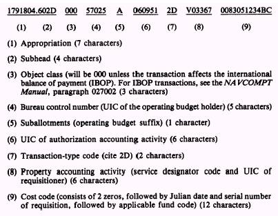 THRESHOLD CONCEPT Much time and effort has been spent by the OPTAR holders and the FAADC in researching and verifying or correcting all transactions appearing in the various transaction listings. Due to the volume of transactions, significant processing delays by both parties have in the past resulted in unworkable backlogs of corrections to the official accounting records. Therefore, threshold procedures have been established to prevent spending undue time and effort on small dollar transactions for operation and maintenance material and services. The dollar level at which the threshold is established is a management prerogative of the fleet commanders. Currently, the threshold is $100 per order in both Atlantic and Pacific Fleets. Under this procedure, when a below threshold category expenditure document ($100 and less) does not match with a corresponding unfilled order document during the second monthly reconciliation process, the FAADC is authorized to lodge the charge against the OPTAR holder without achieving a match. Expenditure documents above threshold ($100 and above) are charged to the OPTAR under similar procedures, if remaining unmatched during the second monthly reconciliation process. These above and below threshold charged expenditures are reported to the OPTAR holder as part of the difference by the FAADC on the Summary Filled Order/Expenditure Difference Listing (SFO/EDL). In addition, the OPTAR holder is authorized to administratively cancel unfilled orders when material has been received 60 days before the date of the Aged Unfilled Order Listing, thereby permitting recoupment of OP-TAR funds on the assumption that either the expenditure has been threshold charged or that no expenditure document will be received. The $100 value per line item has equal application in the review and validation or rejection of expenditures charged to open operating budget transactions. GENERAL FUNDING AND ACCOUNTING The TYCOMs issue an operating budget from the applicable FYDP expense limitation to finance the operations, maintenance, administrative, and temporary additional duty (TAD) travel requirements of their own staff and of units assigned. Records are maintained to show the value of transactions incurred and the available balance of the operating budget, including the values for each OPTAR granted. In addition, submissions of budget reports are required to report the expenditures incurred by expense elements, Each ship, aviation squadron, or command issued an OPTAR is responsible for the efficient and effective use including accurate and timely accounting and reporting according to procedures outlined in NAVSO P-3013. Prompt action must be taken in the search and validation of transactions reported by the FAADC relative to the status of each OPTAR held by the command. To accomplish these accounting and reporting requirements, copies of chargeable requisitions (unfilled orders) are forwarded by each OPTAR holder to the designated FAADC for reconciliation with corresponding expenditures. During the second monthly reconciliation process, unmatched expenditure documents for material or services below the dollar threshold amount established by the fleet commander will be automatically threshold charged to the OPTAR by the FAADC as a difference. Above threshold unmatched expenditures will also be recorded to the OPTAR in the same manner. However, if the expenditure (debit or credit) is $1,000 or greater, the transaction will be held in suspense pending validation by the FAADC. Expenditures applicable to reimbursable OPTARS are exceptions to the threshold concept and require reconciliation with corresponding unfilled orders in every case. Since the threshold charge procedure has the effect of reducing the OPTAR balances, threshold procedures are also applied to aged unfilled orders, which allow for administrative cancellation and reclamation of OPTAR funds. Therefore, upon receipt of the various transaction listings from the FAADC, it is necessary that the OPTAR holder initiate the required validation and specified action to make sure the maximum use is made of the OPTAR funds provided. The accuracy and timeliness of OPTAR record-keeping and reporting determine the accuracy and timeliness of financial management information available to each successive level of command for management of available resources. Figure 2-7 shows the flow of accounting data. REQUISITION ACCOUNTING DATA A fund code is cited on all requisitions to identify the chargeable operating budget and expense element. The accounting data is entered on each purchase document and on all other supply documents that require a complete field of accounting data. Travel orders, work requests, and project orders are not considered as supply documents and should be prepared according to paragraph 4403 of the NAVSO P-3013-2. Each of the nine data fields of a complete line of accounting requires a specific number of data elements to complete its data field. When a data field does not contain sufficient digits to completely fill the data field, zeros are entered preceding the first significant digit to complete the field. When a data field is not required, zeros are entered to completely fill the data field. Country codes are NOT considered as one of the nine data fields of a complete line of accounting data and blocks printed with the term country are to be left blank. The disbursing office assigns the country codes according to the NAVCOMPT Manual, paragraphs 027002 and 046027. Here is an example of a complete line of accounting data (for material or services) with an explanation of each element.