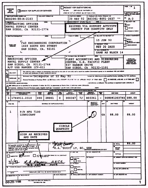 Order for Supplies and Services, DD Form 1155 Receipts from commercial sources on an Order for Supplies and Services, DD Form 1155, are completed by circling the quantity in column 20 and entering the date and signature in block 26 (fig. 3-6). Proper processing of DD Form 1155 receipts requires a familiarity with the terms and concepts discussed in the following paragraphs. Direct delivery. Blocks 13 and 14 of the DD Form 1155 indicate that the material and invoice will be sent directly to the ordering activity. In such cases, the ordering activity is responsible for both a quality and quantity certification, stating that the material was not only received but was also technically acceptable. Receiving personnel are not normally qualified to make these technical judgments, so a technical specialist from the ordering department or unit is contacted to confirm acceptance before the DD Form 1155 has been completed. Figure 3-6 shows receipt for direct delivery on a DD Form 1155. Fast pay procedure. Fast pay is defined as payment made to a commercial source based on proof of shipment by the vendor. This process is limited to items that are considered as not requiring technical certification at the destination. If the fast pay clause (clause 15) is indicated in block 16 of the DD Form 1155, receiving personnel need only receipt for the quantity received in block 26 (fig. 3-6). The quantity in column 20 must be corrected if different from the quantity actually received.