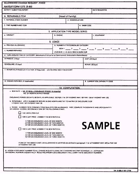 Figure 5-2.-Allowance Change Request-Fixed, NAVSUP Form 1375. (fig. 5-2). A copy of the completed NAVSUP Form 1375 should be retained for local files and attached to the copy of the message request forwarded to the ASO. ACR-F Format The ACR-F, NAVSUP Form 1375 (fig. 5-2), is prepared as follows: l Section A, items 1 through 5. Selfexplanatory. l Item 6 (Usage). Enter previous allowance, number of BCMs (by category), repairs, and actual TAT (the constraints in parentheses should be used in computing the requirements). . Item 7 (Reporting Period). Include the period of time for BCMs and the period of time for repairs. Provide justification for time frames of less than 90 days for BCMs and 60 days for repairs. l Item 8 (Engines Repaired). Selfexplanatory. l Item 9 (Current ICRL Capability Code). Enter the repair capability code from the most current individual component repair list (ICRL). l Item 10 (Computation). The computation method is provided on the form to give the activity an indication of requirement depth based on the activity's data submission to the ASO. These computations are in no way intended to guarantee the requesting activity that the computed quantity will be the actual revised fixed allowance quantity after validation by the ASO. The input data provided by the activity is carefully reviewed independent of and in comparison with the past usage experience of other similar activities. Accordingly, comparative analysis may effect the final ACR-F requirement decision by the ASO. l Section B (Document Number). Selfexplanatory. |