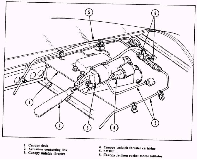 Canopy Contractors The two contractors for canopy up and down are located on the forward bulkhead of the upper equipment bay. The down contactor supplies power to the close winding of the canopy actuator. The canopy up contactor supplies power to the open winding of the canopy actuator. (See fig. 2-4.) Canopy Locked Switch The canopy locked switch is located in the upper equipment bay under the canopy actuator. (See fig. 2-4.) When the switch plunger is depressed by the actuator arm, an electrical signal