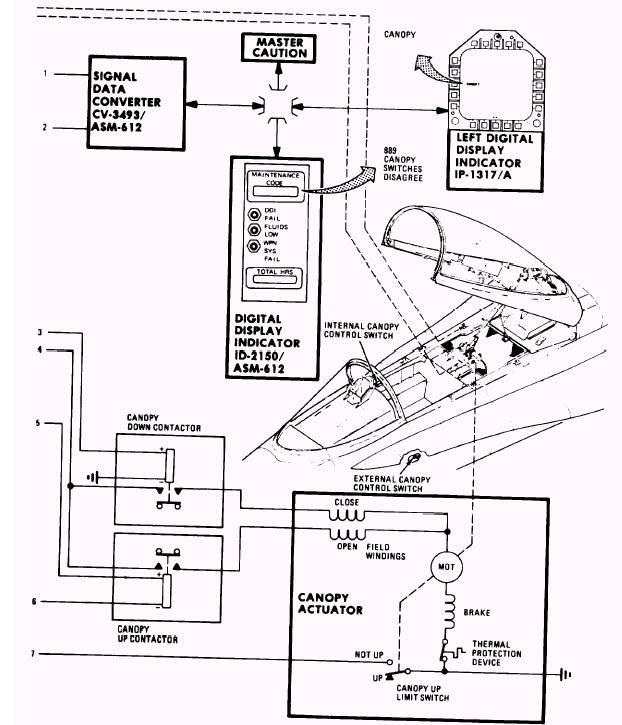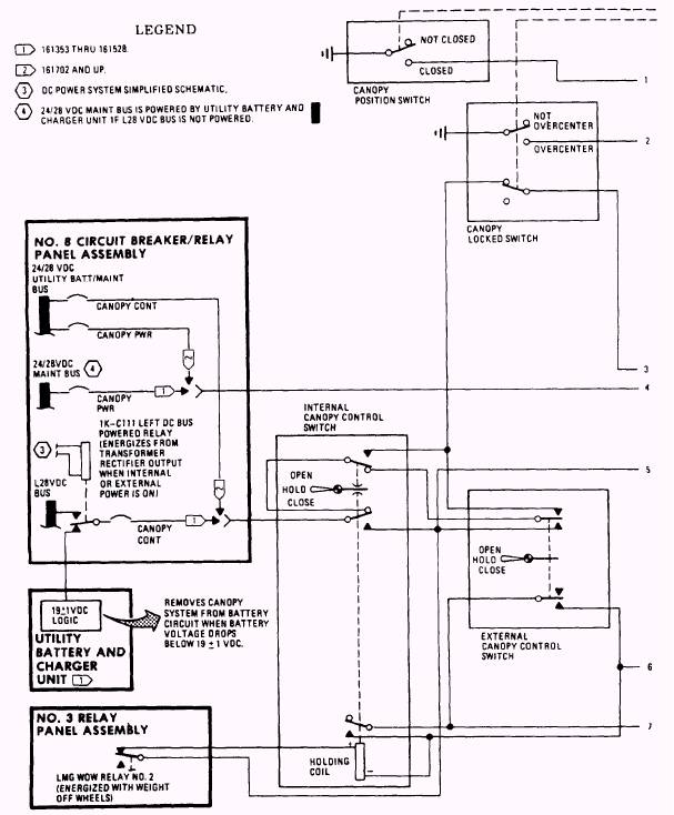 Figure 2-9.-Canopy electrical system schematic-Continued. As previously stated, the canopy external manual drive receptacle is provided to operate the canopy actuator manual drive unit from outside the cockpit. A 3/8-inch drive tool is inserted into the drive receptacle and turned 351 turns counterclockwise to open the canopy or clockwise to close the canopy. Manually operating the canopy overrides the mechanical brake in the canopy actuator. The brake engages to hold the canopy at any position when manual cranking is stopped. The actuator is equipped with a mechanical torque limiter that prevents damage to the actuator if excessive torque is applied to the manual backup control mode.