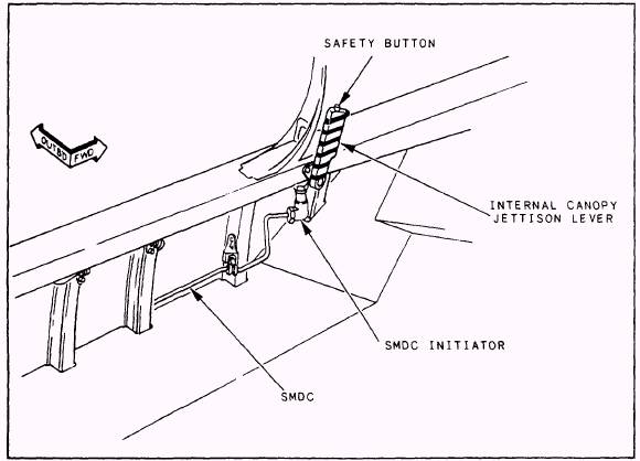 EMERGENCY CANOPY JETTISON SYSTEM Learning Objective: Recognize the system components and procedures for emergency canopy jettison. The emergency canopy jettison system provides the capability to ballistically jettison the canopy in case of an emergency. The canopy can be jettisoned internally or externally without initiating seat ejection. It can also be jettisoned by initiating ejection. This is accomplished by pulling the ejection control handle on the ejection seat. COMPONENTS Before discussing the internal and external methods of jettisoning the canopy, a description of the system's components is needed. External Canopy Jettison Handles And Cables The external canopy jettison handles and cables are stowed behind doors on each side of the aircraft near the radome. (See figs. 2-1 and 2-10.) Each handle is attached to approximately 8 feet of cable. The cables are routed through the gun bay and are joined to a common cable at the cockpit forward pressure bulkhead. This single, common cable runs through the bulkhead into the cockpit, where it connects to the internal canopy jettison lever linkage.
