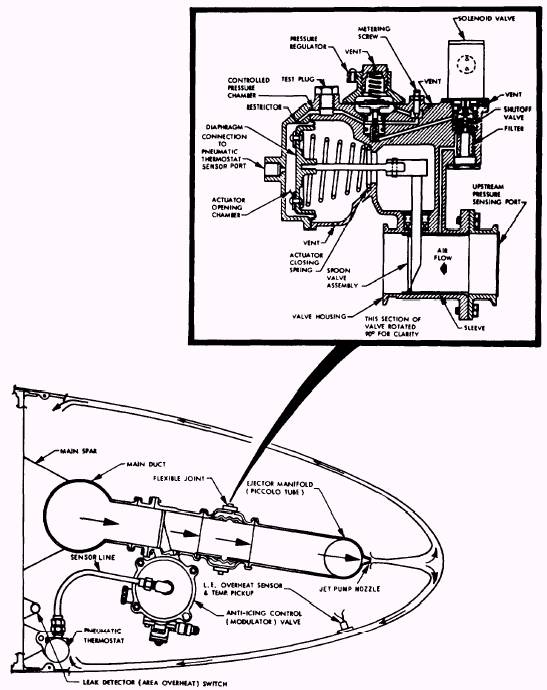 Figure 3-2.-Anti-icing modulating valve. controlled by three switches on the bleed-air section of the ice protection panel. When the solenoid is energized, it admits filtered, regulated, bleed-air pressure to one side of a diaphragm chamber in the valve. The other side of the diaphragm chamber is spring-loaded to the closed position. Movement of the diaphragm operates a main line butterfly valve. When the valve opens, hot air is admitted to the leading edge distribution system. The hot air goes through the modulator valve to the ejector manifold, out the jet nozzles, and into the wing leading edge plenum area. The bleed air is then directed across a pneumatic thermostat. Increased temperature across the thermostat actuates the sensor and opens a bleed passage from the diaphragm chamber. This reduces the pressure on the diaphragm and allows a spring to close the main valve.
