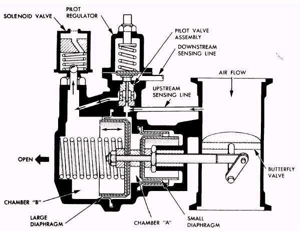 Figure 3-8.-Rain-removal Pressure-regulator shutoff valve. 3-8 top of the large diaphragm combine to hold the valve closed. When the solenoid is energized, air supplied to chamber B bleeds off through the solenoid and the butterfly valve opens. As the butterfly valve opens, air pressure from the downstream side of the valve is applied to the bottom of the pilot regulator diaphragm. This unseats the regulator valve stem and permits upstream air to flow to chamber B. As the downstream pressure varies, a varying amount of air is metered by the pilot regulator valve to chamber B. The metering positions the diaphragm and the butterfly valve to maintain the proper downstream pressure. If the downstream pressure increases to a value in excess of the regulator setting, the pilot valve opens. When this occurs, the solenoid valve is not capable of bleeding off the increased airflow in chamber B. Therefore, chamber B pressure increases, and the butterfly valve moves toward the closed position until regulation pressure is reached.