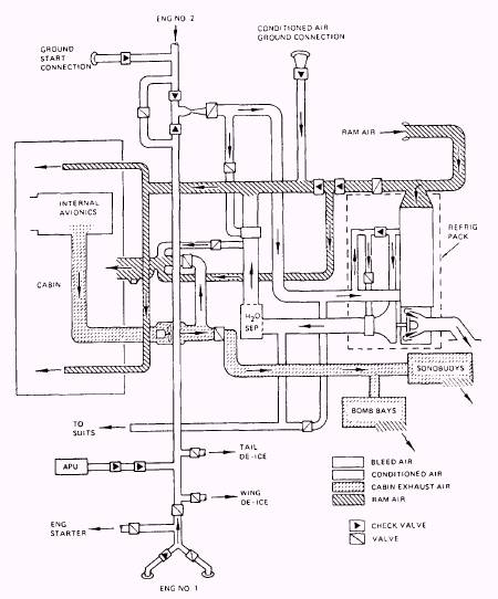 CABIN TEMPERATURE CONTROL SUBSYSTEM A cabin air temperature control sensor is located mid cabin adjacent to the TACCO cooling air inlet. Its purpose is to ensure adequate airflow over the sensor, which measures cabin temperature and sends a signal, along with a signal from the cabin air temperature selector, to the cabin air temperature control. The cabin air temperature control then directs the cabin temperature control modulating valve to maintain a selected temperature in the cabin. During normal cruise, cabin air temperature is controlled by mixing water separator cold air with hot bleed air. The control also acts as an anticipator to stabilize response from the supply duct sensor to the cabin temperature demand. System Operation The cabin temperature control subsystem cools the bleed-air supply by air-cycle refrigeration and ram air mixing to provide a cabin temperature within the range of 60 to 80F during steady and mild transient conditions. The cabin temperature is maintained within 3F of the selected value and a temperature differential of 10F between the floor level and the head level. Humidity control ranges from a relative humidity of 5 to 70 percent. The cabin exhaust air, after passing through the internal avionics and the sonobuoy and weapons bays, is exhausted overboard. Cabin air temperature is monitored by a sensor mounted on the aisle next to the cooling air inlet at the TACCO side console. The sensor measures the flight station air temperature and generates a signal that is transmitted to the cabin air temperature control. Additionally, a signal from the temperature select switch is sent to the control. The cabin air temperature control senses the inlet duct temperature and compares the signals to modulate the cabin temperature control valve. Based on this comparison, it allows the proper amount of hot bleed air to enter the mixing muff at the conditioned air outlet. The cabin air temperature control acts as an anticipator to stabilize the response of the supply duct air temperature to cabin temperature demands. It also minimizes cabin air supply duct temperature changes because of bleed- or ram-air temperature change. (See figure 4-9.) In the manual mode, the automatic controls are overridden to provide manual control of the cabin temperature control valve. Since the cabin air temperature control is bypassed, the 1605F limit on the cabin air temperature control is raised to 18515F, as sensed by the cabin air high-temperature limit thermostat. If the pilot has selected the temperature select switch position for which this 18515F is exceeded, the cabin temperature control subsystem will cycle open and closed until manual control is repositioned or conditions change to reduce maximum supply temperature. The augmented air system provides ram air, as required, to supplement the conditioned bleed air and to provide auxiliary ventilation. This ram air is drawn from the ram-air scoop located in the base of the vertical stabilizer. The ram air is injected into the cabin air distribution ducting downstream from the mixing muff at the junction between the water separator discharge air and the cabin temperature control valve. During unpressurized flight up to 3,500 feet (+1000 or -500 feet) with a ram air temperature between 206F and 726F, ram air supplements the conditioned bleed-air flow to the cabin. When operating in the automatic mode, the ram-air shutoff valve controls the duct-tocabin pressure differential to 7.5 2 inches of water to prevent flooding the cabin with ram air when the aircraft is flying at high speeds. The ram-air shutoff valve is also used to provide auxiliary ventilation by securing the refrigeration package and relying on the pilotoperated auxiliary vent switch to adjust the ram-air shutoff valve. (See figure 4-10.) With the air-conditioning switch set to OFF, setting the auxiliary vent switch to ON closes the cabin recirculating air temperature control valve and opens the cabin pressure regulator valve. If the setting of the ram-air shutoff valve is such that ram pressure fails to satisfy cabin exhaust fan requirements, the negative pressure relief valve opens. This draws additional ambient air from the environmental control system compartment to compensate for any airflow deficiencies. In the event of an automatic shutdown of the air-conditioning or pressurization system during single-engine waveoff, the cabin air supply temperature may change because the ram-air shutoff valve opens. Operation is restored by setting the air-conditioning switch to OFF/RESET and then back to ON, or by setting the auxiliary vent switch to modulate the ram airflow.