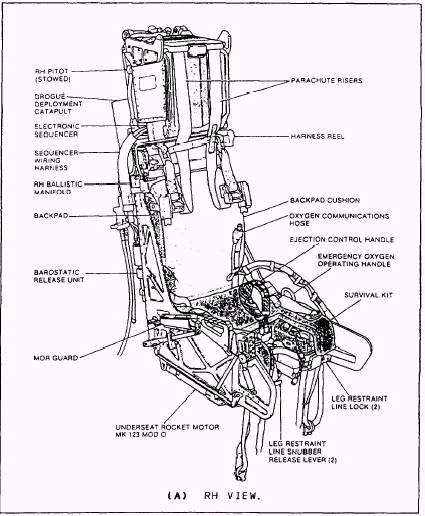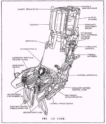 Figure 5-1.-Forward ejection seat; (A) right-hand view, (B) left-hand view-Continued. zero speed, zero altitude in a substantially level attitude to a maximum speed of 600 knots estimated air speed (KEAS) between zero altitude and 50,000 feet. Ejection is initiated by pulling a seat firing handle situated on the front of the seat bucket between the occupant's thighs. The parachute container is fitted with canopy breakers to enable the seat to eject through the canopy should the jettison system fail. After ejection, drogue deployment, man/seat separation, and parachute deployment are automatically controlled by an onboard multimode electronic sequencer. A barostatic harness release unit caters for partial or total failure of the electronic sequencer, and an emergency restraint release (manual override) system provides a further backup in the event of failure of the barostatic release. The seat is ejected by action of the gas pressure developed within a telescopic catapult when the cartridges are ignited. An underseat rocket motor situated under the seat bucket is fired as the catapult reaches the end of its stroke, and sustains the thrust of the catapult to carry the seat to a height sufficient to enable the parachute to deploy even though ejection is initiated at zero speed, zero altitude in a substantially level attitude. The seat is stabilized and the forward speed retarded by a drogue and bridle system, followed by automatic deployment of the personnel parachute and separation of the occupant from the seat. Timing of all events after rocket motor initiation is controlled by the electronic sequencer, which uses altitude and airspeed information to select the correct mode of operation.