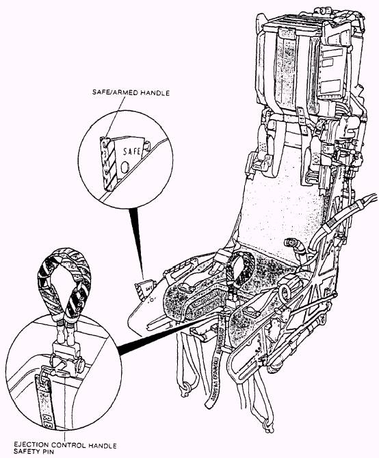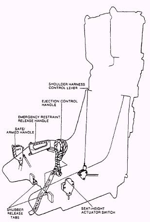 Figure 5-23.-Locations of safety devices. SAFE/ARMED HANDLE.- The SAFE/ARMED handle (figs. 5-21 and 5-23) is located on the RH side of the seat bucket immediately forward of the emergency restraint release handle. Contained within the handle is a catch that locks the handle in either the ARMED or SAFE position. The handle is connected to a linkage that terminates in a safety plunger, which passes through the link of the ejection control handle when the handle is in the SAFE position and prevents operation of the ejection control handle. When in the ARMED position, the visible portion of the handle is colored yellow and black stripes and engraved ARMED; when in the safe position, the visible portion is colored white and engraved SAFE. An electrical visual SAFE/ARMED indicator is incorporated in the cockpit central warning panel, and is operated by a microswitch actuated by the safety plunger. LEG RESTRAINT SNUBBERS.- Two leg restraint line snubbers (fig. 5-24), each with a leg restraint line, are attached to the front face of the seat bucket. Release of the leg restraint line snubbers to adjust the leg lines is effected by pulling inboard on the fabric loops attached to the release plungers on the inboard side of each snubber. The leg restraint lines taper plugs are secured in locks positioned on the seat bucket side plates.