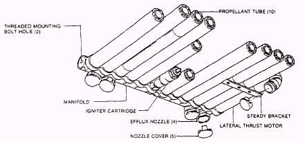UNDERSEAT ROCKET MOTOR.- The underseat rocket motor (fig. 5-20) is a sealed unit and consists of a manifold (machined, drilled, and threaded to accept ten propellant tubes), a lateral thrust motor tube, a cartridge tube, and four efflux nozzles. The propellant tubes are