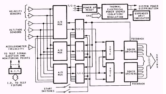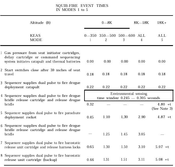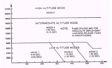 Modes of Operation.- The operational envelope of the NACES is divided into five zones, each of which is associated with a particular timing sequence, known as modes. These timings provide the optimum seat performance under all ejection conditions, both in terms of maximizing the survivable escape envelope and minimizing the risk of occupant injury. Figure 5-30 shows the five zones on the speed versus altitude chart, and table 5-1 gives the corresponding squib-fire timings.