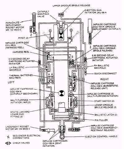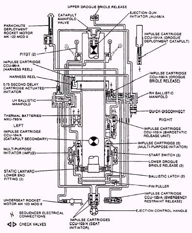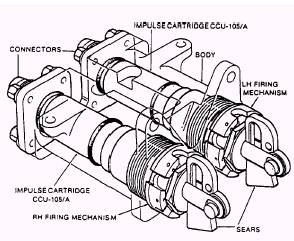BAROSTATIC RELEASE UNIT (BRU).- When the RH multipurpose initiator cartridge fires during ejection, gas pressure from the cartridge enters the piston housing and moves the piston upwards, rupturing the frangible disc and allowing the pawl to pivot clear of the rack assembly slotted end. When the altitude is such that the barostat is not restraining the mechanism, the rack assembly will rise under the action of its spring, the rate of ascent being governed by the delay mechanism. After the delay has elapsed, the rack disengages from the gear train and the firing pin rises rapidly to strike the cartridge. If the cartridge has not previously been fired electrically by the sequencer, the gas produced by the cartridge passes out of the BRU to operate the upperand lower-harness locks and the secondary cartridge in the parachute deployment rocket motor. During ejection, the drogue deployment catapult fires and ejects the drogue and canister. As the drogue deploys, the bridle breaks out of the frangible container and detaches from the channels on the main beams. The drogue stabilizes and decelerates the seat. In the high-altitude mode, the seat descends rapidly on the drogue to a predetermined altitude. The drogue bridle releases then operate, the personnel parachute deploys, and the occupant separates from the seat. In all other modes, the upper and lower drogue bridle releases operate after a short predetermined delay, as the personnel parachute deploys and seat/man separation occurs. The impulse cartridge is fired by an electrical signal from the sequencer. Gas from the cartridge propels the telescopic piston upwards, shearing the end cap rivets. Continued movement of the piston thrusts the canister upwards, shearing the rivets in the threaded ring and propelling the canister and drogue assembly away from the seat. The bridle is pulled from its frangible container and out of the channels on the seat's main beams. As the bridle reaches full extension, inertia causes the canister to fly clear, and the drogue is extracted and deployed to stabilize and decelerate the seat. MULTIPURPOSE INITIATOR.- When ejection is initiated, the catapult ballistic latches operate to retain both multipurpose initiator lanyard spigots. As the seat moves up the guide rails, the static lanyard spigots break the shear pins and the lanyards pay out from the housings. When the lanyards become taut, the upper fittings withdraw the firing pins against spring pressure until the wedge-shaped disconnect devices separate. The firing pins move rapidly upward under spring pressure to fire the cartridges. The gas generated passes to the underside of the piston heads on the start switch plungers. The plungers move up, shearing the shear pins, until the goldplated portions of the plungers complete an electrical connection in the switch assemblies. Sequencer timing then commences. Gas from the cartridges also passes out of the units to the barostatic release unit (RH side only), the pitot deployment mechanisms, and the underseat rocket motor. PITOT ASSEMBLY.- When the pitot assembly is installed on the seat beam, the inboard static pressure connector connects to a void in the seat beam. The sequencer is installed on the forward face of both pitot assemblies and connects to the dynamic and forward static pressure connectors. On ejection, gas pressure from the impulse cartridges in the multipurpose initiators enters the body and operates the lower piston. Movement of the lower piston pushes the pitot arm locking plunger out of engagement with the hole in the body, and at the same time, opens a gas passage to the upper piston. The upper piston moves outward to move the pitot arm to the deployed position. The pitot arm locking plunger engages with the second hole in the body and locks the pitot arm in the deployed position. RH AND LH BALLISTIC MANIFOLDS.- Pulling the ejection control handle withdraws the handle from its housing and both sears from the seat initiator firing mechanisms to fire both impulse cartridges (fig. 5-31). Gas pressure from the RH initiator cartridge withdraws the pin puller, freeing the emergency harness restraint release linkage (figs. 5-32 and 5-33). RH gas pressure also passes to the following: 1. The shoulder harness reel to initiate harness retraction. 2. The thermal batteries. 3. The 0.75-second (forward seat) delay cartridge-actuated initiator mounted on the LH ballistic manifold. 4. The 0.30-second (aft seat) delay cartridge-