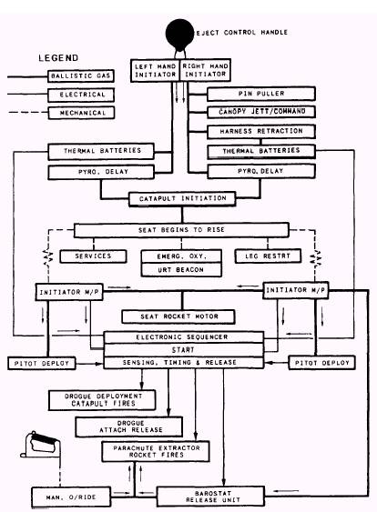 Parachute Canopy and Drogue During the ejection sequence, the parachute deployment rocket motor fires, extends the withdrawal line, and withdraws the parachute in its bag. The parachute canopy emerges from the bag, periphery first, followed progressively by the remainder of the canopy and the drogue. The extractor rocket and bag clear the area. The drogue and crown bridle impart a force on the canopy, proportional to airspeed, to inhibit full canopy inflation until g-forces are reduced. Rotation of the emergency restraint release handle to permit emergency ground egress will rotate the cross shaft of the lower harness release mechanism to release the lower harness locks, leg restraint line locks, and negative-g strap lock. Full rotation of the handle to withdraw the sear of the firing unit is prevented by the pin puller engaging the rear end of the slot in the emergency restraint release operating link. During ejection, gas from the RH seat initiator impulse cartridge enters the pin puller plunger housing and lifts the plunger out of engagement with the groove in the piston. Movement of the plunger allows gas to enter the cylinder and withdraw the piston out of engagement with the slot in the emergency restraint release operating link, the piston being held in the operated position by residual gas pressure. The operating link is then disengaged from the lower harness release cross shaft by the action of a spring-loaded plunger in the operating link guide bracket mounted on the seat bucket side. Seat Survival Kit The seat survival kit (SKU-7/A) operates automatically upon seat ejection. Kit components are maintained by the PR rating. The SKU-7/A contains new equipment. Specific information on the new items was not available at the time of development of this manual. EJECTION SEQUENCE When the ejection control handle is pulled (fig. 5-34), the sears are withdrawn from the seat initiator firing mechanisms and the two impulse cartridges are fired. Gas from the RH cartridge is piped as follows: 1. To the pin puller, which withdraws a piston from engagement in the lower operating link of the emergency restraint release mechanism. 2. To the inboard connector of the command sequencing quick-disconnect on the RH ballistic