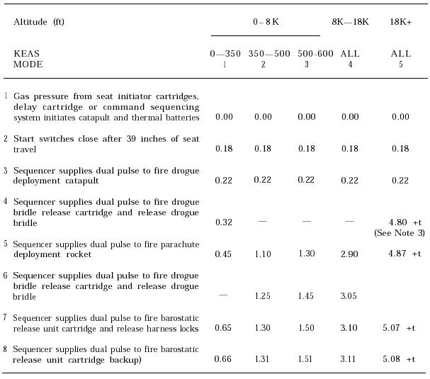 Notes to Table 5-2 1. All times are referenced to seat catapult initiation. To obtain times referenced to sequencer start switches, subtract 0.18 sec. 2. Mode selection environmental sensing takes place between 0.245 sec and 0.305 sec (8 microprocessor cycles). 3. In Mode 5 operation, altitude sensing recommences at 4.80 see, continuing until the seat falls to 18000 ft. t = time interval between 4.80 sec and falling to 18000 ft. 4. Mode decision parameter values are stored in the on-board NOVRAM.