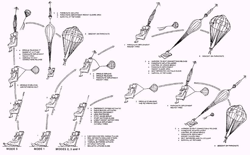 SEQUENCER MODES Electronic sequencer timing (table 5-2) commences when the start switches close. Mode selection is dependent on altitude and airspeed parameters. (See figure 5-35.) All modes. The start switches close after approximately 39 inches of seat travel and, after 0.04 second, the drogue deploys onto the bridle to stabilize and decelerate the seat. Mode 1, low speed - low altitude. The drogue bridle is released, the parachute deployment rocket motor fires to deploy the personnel parachute, and the harness release system operates to free the occupant from the seat. The occupant is momentarily held in the seat bucket by the sticker straps. Modes 2, 3, and 4, medium and high speeds - low altitude and all speeds - medium altitude. The parachute deployment rocket motor fires to deploy the parachute, the drogue bridle is released, and the harness release system operates to free the occupant from the seat. The occupant is momentarily held in the seat bucket by the sticker straps. Table 5-2.-Sequencer Timings