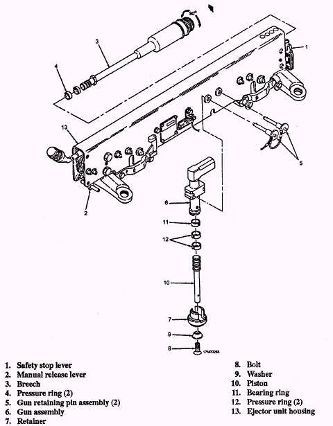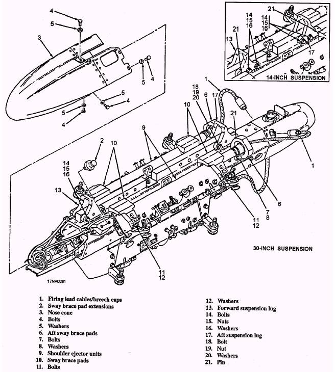 Figure 10-26.-IMER/ITER ejector unit. 10-20 Adapter Assembly The adapter assembly is a hollow, hexagonal aluminum extrusion that forms the main support for the rack assembly hardware. Attaching points on the adapter assembly provide 14-inch or 30-inch spacing of the suspension lugs, which allows installation on the various types of aircraft. The adapter assembly houses the electronic control unit and cable assembly and provides for attachment of six or three individual ejector units. A nose-cone assembly and a tail-cone assembly enclose the ends of the adapter assembly for aerodynamic purposes. Electronic Control Unit The electronic control unit is a solid-state electronic control unit in a sealed container. The electronic control unit controls all the functions of the bomb rack and has the capability of releasing stores at 35-millisecond intervals. The electronic control unit is disposable. If it malfunctions, replace it with a new one. The ejector unit assemblies used on the IMER and ITER are identical. The only difference between them is the internal configuration of the release linkage. The ejector units are configured for right-hand shoulder installation, left-hand shoulder installation, or centerline installation (fig. 10-25). They are identified by part number. The shoulder stations are attached to the adapter assembly by ejector unit attach blocks. The centerline stations are attached by ejector unit attach hangars. A IMER/ITER ejector unit (fig. 10-26) consists of a housing assembly equipped with integral wiring, a breech and ejector mechanism, store suspension hooks, a store sensing switch, two mechanical arming solenoids, an electrical arming unit, adjustable sway braces, and mechanical linkage driven by the breech or manual release lever to open the suspension hooks. The suspension hooks are spaced 14 inches apart and are independently self-latching. There is a manual release lever, which is used to open the hooks during ground operation. The safety stop lever is used to safe the ejector unit mechanically. Look at figure 10-27. It shows the locked and unlocked positions of the ejector unit safety stop lever. When the safety lever is in the locked position, the hook release rod is physically blocked from rearward movement and prevents suspension hook release. If the hook release rod is not in the full forward position, the safety stop lever cannot be rotated to the locked position. A store sensing switch is located under the forward suspension hook, and is actuated by the opening and closing of the hook. |