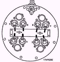 Breech, Breech Cap, and Breech Lead There are two breeches, two breech caps, and two breech leads for each tube of the dispenser. The breech is screwed into the bulkhead so a CUU-44 impulse cartridge can be installed The breech cap, containing the firing pin, screws onto the breech. The breech lead connects to the breech cap and provides a path for the 28-volt dc required to fire the impulse cartridge. Downloading Breech and Downloading Breech Cap There is one downloading breech and a downloading breech cap for each tube of the dispenser. The downloading breech mounts to the bulkhead. The downloading breech cap screws onto the downloading breech. With the downloading breech cap removed, the downloading breech lets you insert the loading, unloading, cleaning, pushrod tool so the stores can be easily removed during downloading procedures. It also prevents air pressure buildup in the tubes when uploading stores. Reinstall the downloading breech caps after the loading or unloading procedures have been completed. Manifold The manifold has eight manifold breech lead receptacles for connection of the breech leads. It also has two test socket assemblies you can use during dispenser electrical test procedures. Stepper Switch The stepper switch provides sequential firing of the impulse cartridges. The switch has 10 functional settings-one safe setting, one arm setting, and eight firing steps. Always place the stepper switch in the safe position during dispenser loading and unloading. Move the switch to the arm position during aircraft arming procedures just before flight. Forward and Aft Retaining Lock Each of the four dispenser tubes contains a forward retaining lock, an aft retaining lock, and an arming mechanism. The forward and aft retaining locks, when in the locked position, protrude into the dispenser tube. This prevents loaded stores from being inadvertently ejected by g forces during aircraft catapult launches. The forward retaining lock is located between the dispenser outer skin and the tube near the midpoint of the dispenser. You can move the retainer lock from the either the locked or unlocked position through an access door located on either side of the dispenser. Before loading a store, rotate the retaining lock to the unlocked position. This pivots the retainer lock out of the tube. After the store has been loaded, rotate the retaining lock to the locked position, and secure it by installing a shear pin. The forward retaining lock retains the forward loaded store only. The aft retaining lock is attached to the aft bulkhead and retains the aft loaded store. It is also secured in the locked position by installing a shear pin. Arming Mechanism The arming mechanism is located in the aft end of the dispenser tube. The arming mechanism initiates the arming sequence of a store as it is ejected from the tube. The dispenser is suspended by two screw-type lugs spaced 14 inches apart. The area around the suspension lugs has a hardback reinforcement to permit sway bracing and forced ejection of the dispenser. Two electrical receptacles, VI and V2, are located forward and aft of the suspension lugs, respectively. Both receptacles give you away to electrically connect the dispenser to the aircraft weapons control system. Only one receptacle is used at a time. The electrical configuration of the rack determines the receptacle you will use. An electrical wiring harness is routed internally from electrical connectors V1 and V2 to the stepper switch. The wiring harness is interrupted by a safety switch that is normally in the closed position. When the safety pin and flag assembly are inserted, the safety switch is held in the open position and the electrical circuits are grounded, making the dispenser electrically safe. Functional Description When you load a dispenser tube with munitions, each pair of flares/sonobuoys are configured with an ADU-381/A flare adapter kit. Also, you should enclose sonobuoys in a Mylar sheet (protective sleeve) and install a protective disk. A yellow-colored sealing ring is pressed on each end of the munition as a seal between the munition and the tube body. This prevents gas pressure from escaping during ejection. A green-colored arming cap is installed on the timer end of a flare or on the rotochute end of a sonobuoy. The green arming cap lanyard is connected to the timer knob of the flare, and then pressed on over the flange of the sealing ring. When you install an arming cap on the sonobuoy, the lanyard is not used. Mount a white cross-shaped plastic spacer on the aft sealing ring of the forward munition. This provides enough space between the forward and aft munition to provide an expansion chamber for ejecting the aft munition. After you have installed the adapter, install the munitions in the dispenser tube. When a SUU-25F/A dispenser is fully loaded and uploaded on the aircraft, the pilot may eject flares. The pilot must first select the weapons control system, and then trigger the dispensing switch. A 28-volt dc electrical signal passes through an electrical cable from the aircraft to either receptacle J1 or J2 of the dispenser. The signal is routed from the dispenser receptacle to the stepper switch, causing the stepper switch to step from the preset ARM position to the No. 1 position. This fires the No. 1 impulse cartridge. The gas pressure, generated by the fired cartridge, is ported through a gas tube, internally along the side of the dispenser, into the aft expansion chamber ahead of the aft flare. As the gas pressure increases, the aft retaining lock shear pin is cut, allowing the aft flare to eject. As the timer end of the flare approaches the rear of the tube, the arming finger of the arming mechanism engages the yellow sealing ring. The sealing ring cams the arming finger down, which, in turn, cams the arming hook up to engage the green arming cap. This action allows the flare to extend the lanyard. The lanyard extracts the timer knob and arms or starts