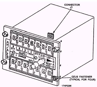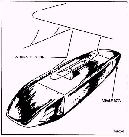 AN/ALE-37A COUNTERMEASURES CHAFF DISPENSING SET The AN/ALE-37A countermeasures chaff dispensing set (fig. 10-40) is externally mounted on aircraft MER/TER ejector racks that have 14-inch suspensions. When mounted on the aircraft, the AN/ALE-37A has various patterns of chaff, decoy flares, or expendable jammers. Dispensing is dependent upon control settings and aircraft speed. Several dispensing pods may be employed on a single aircraft to provide maximum countermeasure capabilities. The dispensing set is of modular construction, making maintenance easier and reducing turnaround time. Each dispensing pod contains two lightweight payload modules. Each payload module has a capacity of 120 rounds, providing a total capacity of 240 rounds. When empty, the pod weighs 180 pounds. When fully loaded, the pod weighs approximately 277 pounds.