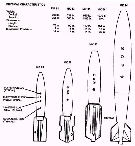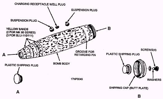 GENERAL-PURPOSE BOMBS AND FIN ASSEMBLIES LEARNING OBJECTIVE: Identify the purpose and use of general-purpose bombs to include shipping configuration, fuze wells and charging circuits, suspension lugs, arming wire assemblies, and fin assemblies. Low-drag, general-purpose (LDGP) bombs are used in most bombing operations. Their cases (bomb body) are aerodynamically designed, relatively light, and approximately 45 percent of their weight is made of explosives. General-purpose bombs may use both nose and tail mechanical or electric fuzes and conical or Snakeye fins. The general-purpose bombs currently in use are the LDGP Mk 80 (series). The specifications for the individual bombs are listed in fig 1-20. The basic difference between the bombs listed in fig 1-20 is their size and weight. The following description of the Mk 80 (series) bomb is applicable to all bombs within the Mk 80 (series) unless otherwise noted. SHIPPING CONFIGURATION The bomb body (fig. 1-21) is shipped with a plastic plug installed in the nose and tail fuze well to prevent damage to the internal threads and to keep out moisture. The aft end of the bomb body has a metal shipping cap installed. Plastic lug caps are installed in the suspension lug wells, and a plastic plug is installed in the fuze charging receptacle well. Some bombs contain a hoisting lug packaged in the tail fuze well. Bombs are shipped on metal pallets. The number of bombs loaded on each pallet depends on the bomb size. For example, six Mk 82 bombs can be shipped on a pallet, three Mk 83 bombs can be shipped on a pallet, and two Mk 84 bombs can be shipped on a pallet. Refer to Airborne Weapons Packaging/Handling/Stowage, NAVAIR 11-120A-1.1 or appropriate MIL-STD for more information on shipping configurations. FUZE WELLS The bomb body is designed with a nose and tail fuze well. These wells are internally threaded to receive either mechanical or electric fuzes. FUZE CHARGING CIRCUIT The forward and aft charging tubes are installed at the factory and contain the electric fuze wire harness. When electric fuzing is used, the wire harness provides a path for the charging current from the fuze charging receptacle to the forward and aft fuze wells. SUSPENSION LUGS There are two suspension lug wells for the installation of suspension lugs. The suspension lugs are spaced 14 or 30 inches apart, depending upon the size