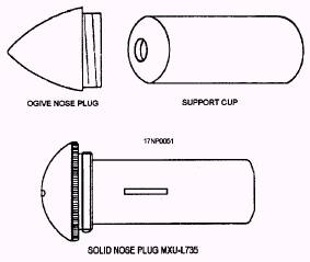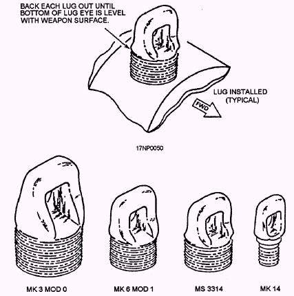 Figure 1-22-Suspension lug installation. of the bomb. Suspension lugs (fig. 1-22) are used to attach the weapon to the aircraft bomb racks. An internally threaded well for the installation of a hoisting lug is located between the suspension lugs, at the center-of-gravity (CG) position on the bomb. The hoisting lug is used for handling purposes only. There are two basic nose plugs (fig. 1-23) used in general purpose bombs, solid nose plug (MXU-735/B and MXU-735A/B), and the ogive nose plug. The ogive nose plug provides a pointed arch. A support cup is used in the nose well with the ogive nose plug to provide a solid structure to the bomb. The MXU-735 solid nose plug is designed to provide better penetration of hard targets, without the likelihood of nose plug shearing during oblique impact. The MXU-735 replaces the ogive nose plug and support cup. IDENTIFICATION The high-explosive filler of the bomb (Tritonal 80-20 or H-6) is identified by the yellow stenciled nomenclature on the bomb body and yellow band(s) around the nose. The lot number is stenciled in white ink on the forward end of the bomb. All Mk 80 (series)