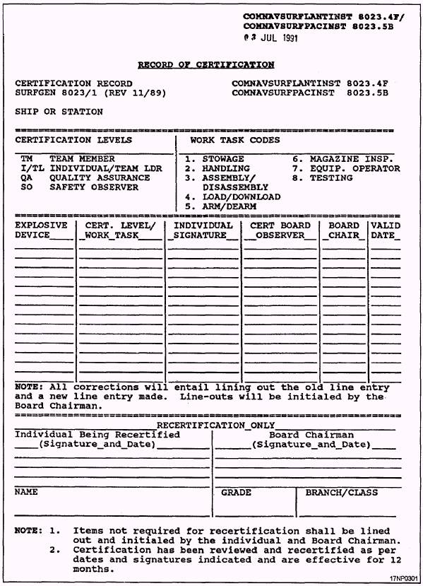 Figure 11-1.-Record of Certification. Family groups. Family groups are explosive devices with similar characteristics. Handling. Applies to those individuals who engage in the break out, lifting, or repositioning of explosive devices in order to facilitate storage/stowage, assembly/ disassembly, load/download, or transporting. Individual signature. Signature of person being certified. Signing acknowledges certification level and work task code for the explosive device/family; therefore, a signature is required for each line entry. Load/download. Applies to procedures contained in the load/download section of the loading manual/ checklist for that particular explosive device. Magazine inspections. Applies to the close viewing and critical appraisal of existing conditions within ship/station magazines or ready service magazines/ lockers, using standards established by NAVSEA OP 4 and OP 5. Recertification. Recertification may be accomplished using the space provided. One the individual being recertified and the board chairman signs and dates the form, certification is valid for 1 year. Storage/stowage. Applies to those individuals whose responsibilities involve storage/stowage of explosive devices. (See OP 2165, volume 1.) Validation date. Date certification is effective. |