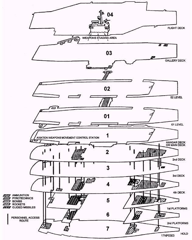 LEARNING OBJECTIVE: Describe the types of ammunition stowage afloat. Identify the types of stowage spaces afloat to include types of magazines, magazine designations, ammunition stowage requirements, environmental control systems, sprinkler systems and auxiliary equipment, and magazine temperature requirements. Stowing ammunition aboard ship presents problems you won't find in other types of storage facilities. When ships are undervay, they are subjected to random motion. Ammunition is fastened in place firmly and securely when it isn't being handled. Adequate ventilation is a problem. Most ammunition stowage spaces are located below the main deck. Normally, these areas require extensive piping and venting to maintain proper temperature control and to vent hazardous fumes. Access to stowage spaces often requires specialized equipment for moving ammunition quickly and efficiently. Stowage spaces are located close to other working spaces, which presents hazards to others on the ship, especially if there were afire or explosion. AMMUNITION STOWAGE SPACES NAVSEASYSCOM develops and approves the detailed specifications for construction of Navy ships and individual ship's blueprints. Ammunition stowage spaces (magazines) for various types and classes of ships are designated in these specification. Aircraft or aircraft carriers' ammunition stowage magazines are also approved by NAVAIRSYSCOM. Magazines are arranged so they are close to supply, have the best available protection, and the most favorable stowage conditions. Figure 11-3 shows the
