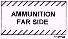 Figure 11-4.-Example of AMMUNITION FAR SIDE sign or label. Because of the nature of guided missiles, requirements for their stowage aboard ship differ from those of conventional ammunition. Air-launched missile magazines in aircraft carriers are usually located below the waterline and within the armor box. Air-launched missile ready-service magazines may be located either above the waterline or within the armor box. Missile magazines contain electrical, hydraulic, and pneumatic power-operated handling equipment. A restraining gear prevents movement of an accidentally ignited motor. Magazines are equipped with specialized detection equipment to make sure that a specific missile hazard isn't present. You must take special care of the ventilation system of missile magazines to ensure pressures don't build up to a dangerous level if a missile motor is ignited. Additional fire-fighting equipment is often provided for missile magazines. This equipment may consist of carbon dioxide, foam, water injection, or a sprinkler system, or a combination of these systems. NAVSEASYSCOM specifically certifies the magazine for the stowage of hyperbolic-fueled missiles, such as the AQM-37 target drone and fuel-air explosive (FAE) weapons. FAE weapons and the AQM-37 are compatible in stowage. FAE weapons require less stringent certified facilities; therefore, FAE weapons can be stowed in hyperbolic magazines. However, hyperbolic-fueled items cannot be stowed in magazines certified for FAE only. |