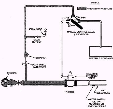 SPRINKLER AND ALARM SYSTEMS Primary and missile magazines, ammunition handling rooms, and most ready-service magazines are fitted with sprinkler systems. Sprinkler systems consist of spray heads or sprinkler-head valves arranged to dash water directly on the munitions and completely cover the magazine's interior. Sprinkler systems for spaces located below the damage control deck (second deck on aircraft carriers) are arranged for local control at the valve and for remote control from the damage control deck (fig. 11-6) On aircraft carriers, the remote controls are normally divided into two groups-forward