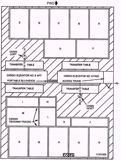 Figure 11-8.-Typical LFORM ammunition stowage plan for an LHA-1. ammunition stowed. Figure 11-5 shows a ready-service magazine configured for ready-service missiles. Notice some missiles are stowed in cradles attached to the bulkhead. Other missiles are loaded onto handling equipment and ready for immediate issue. In larger magazines, such as primary missile magazines, stanchions may be installed in sockets provided in the deck and overhead. Cradles are attached to the stanchions to stow a large number of decanned, ready-service missiles. Straps are used to secure the missiles in the cradles. Stanchions are also used to divide a large magazine area into smaller areas or bins (fig. 11-9) to hold various sizes of ammunition with a minimum loss of space. The stanchions are fitted with slots or have other means for receiving battens. The battens (which run horizontally) provide the walls that form the bin. No matter which stowage method is used, arrange the stowage area so access to as much ammunition and as many containers as possible is provided, and provide adequate space for ventilation and handling operations. Stow ammunition and explosives on dunnage to provide an air space so all parts of the magazine receive maximum ventilation and exposure to the sprinkler system. Mk 3 or Mk 12 metal pallets are used as dunnage aboard aircraft carriers. These have the correct space between the deck and stowed material. They also provide adequate grounding, Additionally, make sure that there is an air space of not less than 2 inches between any ammunition stowage stack and the surface of adjacent plating or sheathing. Stow the stacks of ammunition so sprinkler systems, circuit F sensors, or air escape lines aren't obstructed. When different lots and/or types of ammunition are stored in the same magazine, segregate the ammunition by lot, size, and type. Record this information on magazine cards and post them in the magazine. Ships at sea move randomly; therefore, securely fasten all hazardous munitions and explosives in place, except when they are actually being handled. In some cases, stanchions and battens provide adequate security. Other types of ammunition stows, such as palletized bombs or missile containers, are secured by tie-down chains especially designed for this purpose. Connect the tie-down chains to the load and the deck tie-down points so even the slightest movement of the ammunition is prevented. MAGAZINE INSPECTION AND VISUAL SURVEILLANCE OF AMMUNITION The terms magazine inspection and visual surveillance of ammunition mean the same thing. They apply to the inspection of magazines and their contents. Aboard ship, these inspections are mandatory according to The Ships' Maintenance and Material Management (3-M) Manual, OPNAVINST 4790.4, other Navy regulations, and NAVSEASYSCOM instructions. Magazine inspections are part of the ship's Preventive Maintenance System (PMS), and they should only be conducted by qualified personnel. These personnel use a check sheet (maintenance requirements card) to ensure that a hazard or abnormal condition is not overlooked. Generally, the daily visual inspection of magazines consists of checking for the following: Improperly secured stowage Unsatisfactory protective packaging Unusual fumes or odors Magazine cleanliness Other abnormal conditions Abnormal conditions in a ship's magazine or ammunition stowage space include evidence of tampering to gain access, evidence of theft, evidence of temperature or humidity fluctuations, and the presence of unauthorized materials. Abnormal conditions also include evidence of localized overheating from adjacent compartments on decks, bulkheads, and overheads; indications of leaks from sprinkler or flood pipes, nozzles, or control valves and regulators; and inoperable or damaged reach-rods, linkages, automatic fire alarm devices, and other similar equipment in the specific hazard stowages. Record the results of all magazine inspections on the appropriate PMS schedule. An important requirement of the daily magazine inspection is observing, recording, and reporting maximum and minimum temperature conditions in each stowage space. A maximum-minimum thermometer (one or more per magazine) is placed in all magazines when ammunition is stowed in them. The