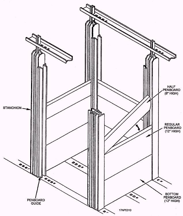 Figure 11-9.-Typical stanchions and bin configuration. maximum-minimum thermometer (fig. 11-10) is a U-shaped, mercury-filled, glass tube with two bulbs. You determine the current temperature by the level of the mercury in either arm of the tube. The current temperature indicated by the thermometer shown in figure 11-10 is approximately 95F. The mercury level in each side of the tube should indicate the same temperature reading. If the readings are not the same on both sides of the tube, replace the thermometer. The maximum and minimum temperatures may be determined by observing the position of the steel index marker located in either side of the glass tube. If the temperature increases, the mercury rises upward in the right-hand scale, forcing the steel index marker upward, while the mercury in the left-hand scale decreases downward and the steel index marker remains stationary. If the temperature decreases, the mercury in the left-hand scale rises, forcing the steel index marker upward, while the mercury in the right-hand scale decreases downward and the steel index marker remains stationary. The maximum temperature indicated on the thermometer illustrated is approximately 100F. The reference point for taking all maximum and minimum readings is always from the bottom edge of the steel index marker. The minimum temperature indicated is approximately 45F. After recording the temperature readings on the magazine temperature card, zero the thermometer. You use a horseshoe-shaped magnet to zero the thermometer. Place the magnet against the glass and draw it downward so each steel index marker is drawn down to the level of mercury. |
