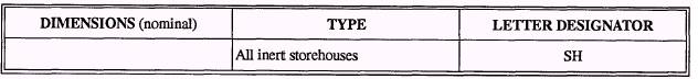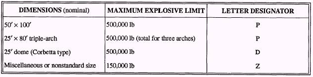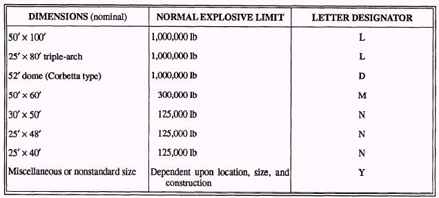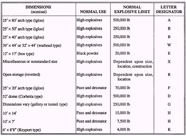 designation as indicated in tables 12-6, 12-7, 12-8, and 12-9. To show the type of magazine, for example, the letter T is added if the magazine is earth-covered and barricaded If the magazine is earth-covered but not barricaded, the letter C is added. If the magazine is not earth-covered but is barricaded, the letter S is added. Therefore, in the magazine designator 4XTX4, the letter X in the second position indicates that the magazine size is miscellaneous or nonstandard, and it is normally used for storing high explosives. Also, the normal explosive storage limit depends on the magazine's size, location, and type of construction. The explosive limits contained in tables 12-4 through 12-7 are maximum capacities, They are based on magazine design and construction characteristics. These limits are further subject to the Q-D considerations discussed previously. Additional limitations are shown in the magazine designator. When the Q-D relationship, as indicated in the tables, doesn't permit using the explosive capacity design of a standard magazine because of insufficient separating distances, the letter X, Y, or Z is added to the designator. These letters indicate the magazine contains mass detonation hazards, mass fire hazards, or fragment-producing hazards, respectively. For example, in the magazine Table 12-9.-Magazine Designators for Miscellaneous Magazines