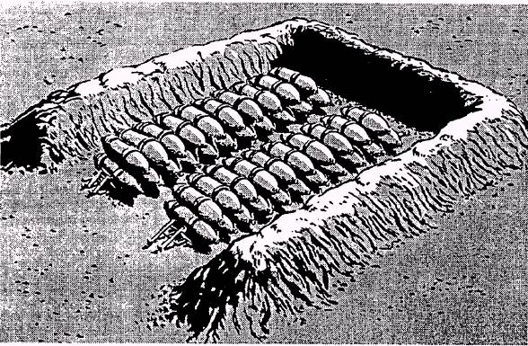 Figure 12-7.-Revetted stowage of aircraft bombs. 2. A letter or group of letters designating the type and capacity of the magazine, and 3. A number designating the sequence of the magazine within the magazine group or area. Letter designators for advanced base storage are indicated in table 12-11. To indicate the nature of the construction of the magazine, the letter T is added if the magazine is earth-covered and barricaded; the letter C is added if the magazine is earth-covered, but the door isn't barricaded. The letter T is also used to designate revetted storages. Advanced base magazines, buildings used as magazines, caves, tunnels, and open storage sites do not conform to the standard magazine sizes prescribed in NAVSEA OP 5, volume 1. Therefore, the letters X, Y, or Z that identify explosion hazard, fire hazard, or fragment hazard, respectively, are used in place of the standard letter designators. Accordingly, XT is applied to an earth-covered, barricaded, advanced base magazine that is used for storing high explosives. Also, RZT is part of a designator for fragment-hazard material in a revetted storage. In addition, the following information must be conspicuously posted on one door in each magazine or building that contains ammunition 1. The hazard classification of ammunition (explosion, fire, or fragment) stored there. 2. The maximum quantities of ammunition in each hazard classification as determined from the quantity-distance (Q-D) tables. Table 12-11.-Letter Designators for Advanced Base Storage