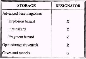 EXISTING BUILDINGS.- Occasiona1ly, existing buildings are used to store ammunition. Each building should be of fire-resistant construction, and it should protect ammunition against moisture and dampness. It should have adequate ventilation and have substantial flooring to support the ammunition. An existing building should afford adequate protection to the ammunition and adjacent areas. CAVES AND TUNNELS.- Caves and tunnels are used to store ammunition if they are reasonably dry and free of moisture seepage. Most types of ammunition may be stored in caves and tunnels. In very hot climates, however, don't store ammunition that contains smokeless powder in caves and tunnels unless they are ventilated, either by natural or artificial means, to prevent the accumulation of ether fumes. OPEN STORAGE.- Ammunition is stored in the open at advanced bases to supplement magazine space. However, when ammunition is stored outdoors, special consideration must be given to protecting it from the elements. Identification of Magazines and Open Storage Sites When practicable, magazines, buildings used as magazines, and piles of ammunition stored in the open are marked according to the system of identification you have already read about. At advanced bases, the identification system consists of two parts-a group construction symbol and a symbol hazard indicator. The group construction symbol is a three-group symbol that consists of the following: 1. A number indicating the group in which the magazine or open storage site is located,