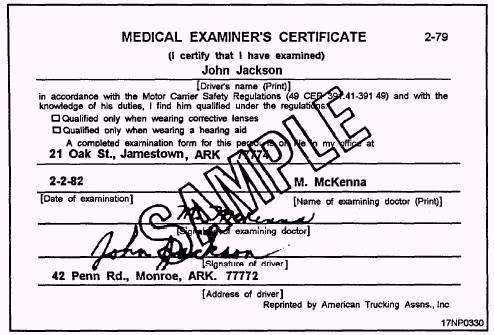 Figure 12-9.-Medical Examiner's Certificate, ATA Form C0750. outside the 50 states who would otherwise be eligible to obtain an explosives driver's permit. MEDICAL EXAMINER'S CERTIFICATE.- An explosives driver must undergo an annual physical examination and, on the basis of such an examination, be certified by a licensed doctor of medicine or osteopathy to ensure that he/she meets applicable requirements as stated in the Federal Motor Carrier Safety Regulations. Applicants who pass the prescribed annual physical examination are issued a Medical Examiner's Certificate, ATA (American Trucking Association) Form C0750. (See fig. 12-9.) This certificate, in addition to the explosives driver's permit, must be on the operator's person while driving any vehicle transporting HM. EXPLOSIVES DRIVER PERMIT.- An explosives driver must hold a U.S. Government Motor Vehicle Operator's Identification Card, Standard Form 46 (SF 46). (See fig. 12-10.) The card will be noted: "Explosives Driver (Must hold a current medical certificate)." The SF 46 is valid for 3 years and must be renewed prior to expiration. A yearly endorsement is not required. An individual's safety record and physical requirements will be considered prior to recertification as an explosives driver. AGE AND EXPERIENCE.- An explosives driver must be 18 years of age or older to operate motor vehicles transporting HM on-station and 21 years of age