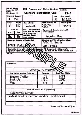 Figure 12-10.-U.S. Government Motor Vehicle Operator's Identification Card, SF 46. or over for off-station motor vehicle HM operations. The explosives driver must also have had considerable and varied driving experience with the type of equipment to be operated and have a safe driving record. MENTAL REQUIREMENTS.- Applicants, military and civilian, are required to pass a mental examination that is administered by the local command before they can be considered eligible to be explosives drivers. ALCOHOL AND DRUGS.- An applicant for explosives driver certification found to be addicted to alcohol or drugs is rejected Certification is revoked for an explosives driver found to be under the influence of alcohol or drugs while on duty or when showing evidence of addiction. Temporary revocation of HM certification may become necessary when the use of physician-prescribed drugs are likely to interfere with the driver's ability to operate a motor vehicle safely. ABILITY TO READ AND UNDERSTAND REGULATIONS.- An explosives driver must be able to read, write, and understand the English language, and to complete the various forms for which a driver is responsible. The driver is required to read and understand the regulations that pertain to the duties as prescribed in NAVSEA OP 2239. In addition to these qualifications, if you apply for certification as an explosives driver, you are required to complete an explosives driver's training course and pass the tests given at the conclusion of the course. All explosives drivers receive at least 12 hours of instruction in the following activities: Driving trucks, truck-tractors with semitrailers, and other vehicles of appropriate types Handling and transporting hazardous materials Interpreting regulations and procedures pertaining to the transporting of hazardous materials Training and use of fire extinguishers Completing and filing required reports When operating Navy-owned vehicles, you, as an operator, must comply with DOD regulations and all state and local traffic laws. You are also subject to fine or imprisonment when you violate these regulations and traffic laws. |